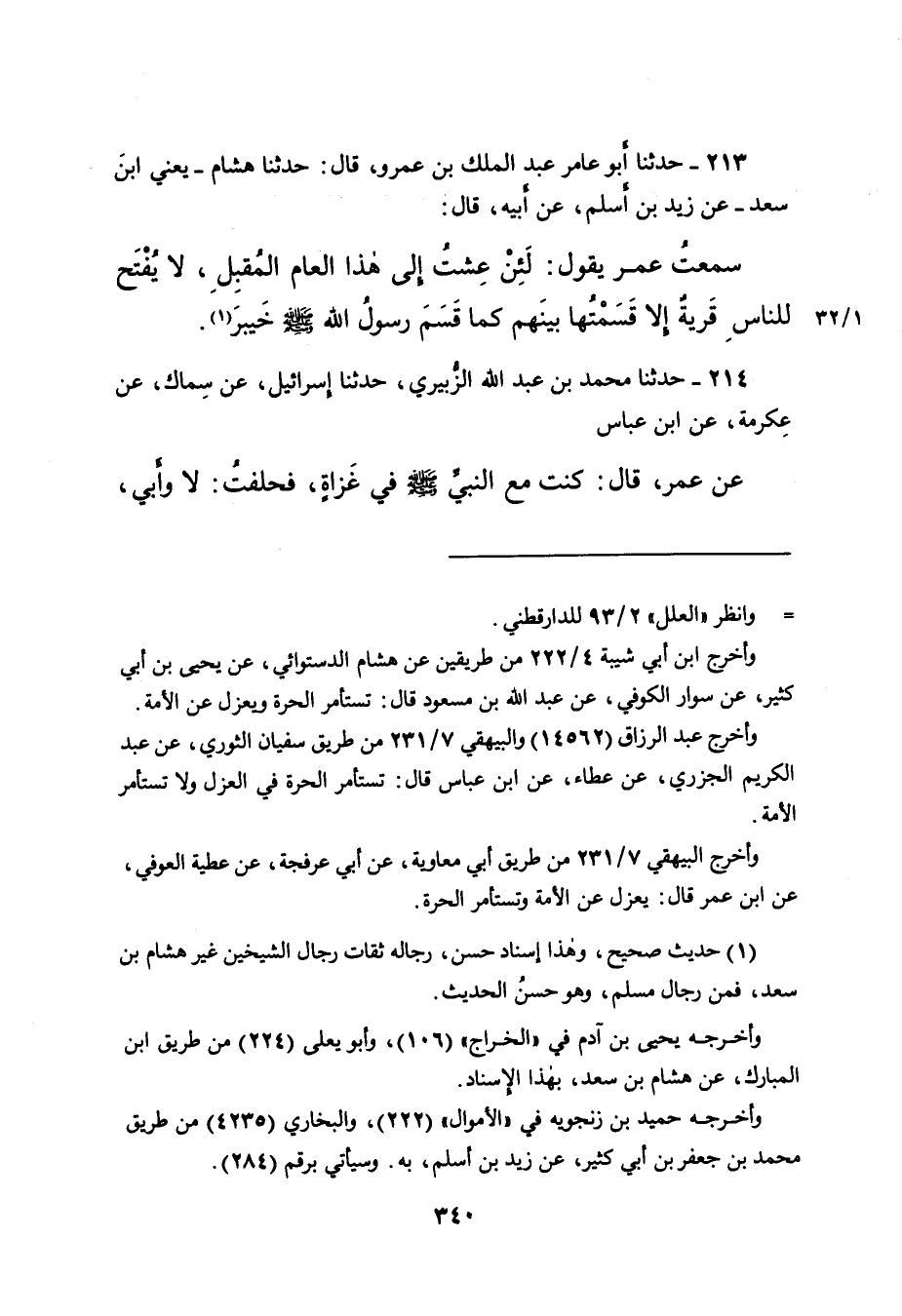 سَمِعْتُ عُمَرَ، يَقُولُ: لَئِنْ عِشْتُ إِلَى هَذَا الْعَامِ الْمُقْبِلِ، لَا يُفْتَحُ لِلنَّاسِ قَرْيَةٌ إِلَّا قَسَمْتُهَا بَيْنَهُمْ كَمَا قَسَمَ رَسُولُ اللهِ صَلَّى اللهُ عَلَيْهِ وَسَلَّمَ خَيْبَرَ (١) .