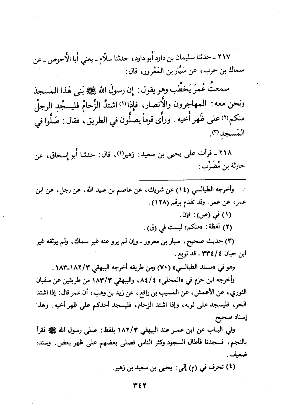 سَمِعْتُ عُمَرَ يَخْطُبُ وَهُوَ يَقُولُ: إِنَّ رَسُولَ اللهِ صَلَّى اللهُ عَلَيْهِ وَسَلَّمَ بَنَى هَذَا الْمَسْجِدَ وَنَحْنُ مَعَهُ: الْمُهَاجِرُونَ وَالْأَنْصَارُ، فَإِذَا (١) اشْتَدَّ الزِّحَامُ فَلْيَسْجُدِ الرَّجُلُ مِنْكُمْ (٢) عَلَى ظَهْرِ أَخِيهِ. وَرَأَى قَوْمًا يُصَلُّونَ فِي الطَّرِيقِ، فَقَالَ: صَلُّوا فِي الْمَسْجِدِ (٣) .