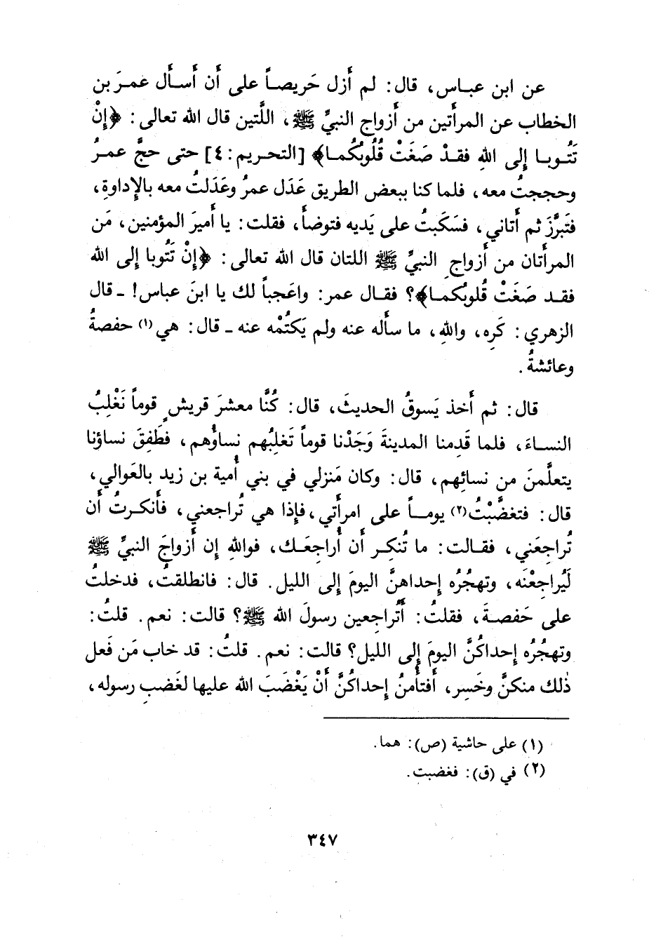عَنِ ابْنِ عَبَّاسٍ، قَالَ: لَمْ أَزَلْ حَرِيصًا عَلَى أَنْ أَسْأَلَ عُمَرَ بْنَ الْخَطَّابِ عَنِ الْمَرْأَتَيْنِ مِنْ أَزْوَاجِ النَّبِيِّ صَلَّى اللهُ عَلَيْهِ وَسَلَّمَ، اللَّتَيْنِ قَالَ اللهُ تَعَالَى: {إِنْ تَتُوبَا إِلَى اللَّهِ فَقَدْ صَغَتْ قُلُوبُكُمَا} [التحريم: ٤] حَتَّى حَجَّ عُمَرُ وَحَجَجْتُ مَعَهُ، فَلَمَّا كُنَّا بِبَعْضِ الطَّرِيقِ عَدَلَ عُمَرُ وَعَدَلْتُ مَعَهُ بِالْإِدَاوَةِ، فَتَبَرَّزَ ثُمَّ أَتَانِي، فَسَكَبْتُ عَلَى يَدَيْهِ فَتَوَضَّأَ، فَقُلْتُ: يَا أَمِيرَ الْمُؤْمِنِينَ، مَنِ الْمَرْأَتَانِ مِنْ أَزْوَاجِ النَّبِيِّ صَلَّى اللهُ عَلَيْهِ وَسَلَّمَ اللَّتَانِ قَالَ اللهُ تَعَالَى: {إِنْ تَتُوبَا إِلَى اللَّهِ فَقَدْ صَغَتْ قُلُوبُكُمَا} ؟ فَقَالَ عُمَرُ: وَاعَجَبًا لَكَ يَا ابْنَ عَبَّاسٍ! - قَالَ الزُّهْرِيُّ: كَرِهَ، وَاللهِ، مَا سَأَلَهُ عَنْهُ وَلَمْ يَكْتُمْهُ عَنْهُ - قَالَ: هِيَ (١) حَفْصَةُ وَعَائِشَةُ. قَالَ: ثُمَّ أَخَذَ يَسُوقُ الْحَدِيثَ، قَالَ: كُنَّا مَعْشَرَ قُرَيْشٍ قَوْمًا نَغْلِبُ النِّسَاءَ، فَلَمَّا قَدِمْنَا الْمَدِينَةَ وَجَدْنَا قَوْمًا تَغْلِبُهُمْ نِسَاؤُهُمْ، فَطَفِقَ نِسَاؤُنَا يَتَعَلَّمْنَ مِنْ نِسَائِهِمْ، قَالَ: وَكَانَ مَنْزِلِي فِي بَنِي أُمَيَّةَ بْنِ زَيْدٍ بِالْعَوَالِي، قَالَ: فَتَغَضَّبْتُ (٢) يَوْمًا عَلَى امْرَأَتِي، فَإِذَا هِيَ تُرَاجِعُنِي، فَأَنْكَرْتُ أَنْ تُرَاجِعَنِي، فَقَالَتْ: مَا تُنْكِرُ أَنْ أُرَاجِعَكَ، فَوَاللهِ إِنَّ أَزْوَاجَ النَّبِيِّ صَلَّى اللهُ عَلَيْهِ وَسَلَّمَ لَيُرَاجِعْنَهُ، وَتَهْجُرُهُ إِحْدَاهُنَّ الْيَوْمَ إِلَى اللَّيْلِ، قَالَ: فَانْطَلَقْتُ، فَدَخَلْتُ عَلَى حَفْصَةَ، فَقُلْتُ: أَتُرَاجِعِينَ رَسُولَ اللهِ صَلَّى اللهُ عَلَيْهِ وَسَلَّمَ؟ قَالَتْ: نَعَمْ، قُلْتُ: وَتَهْجُرُهُ إِحْدَاكُنَّ الْيَوْمَ إِلَى اللَّيْلِ؟ قَالَتْ: نَعَمْ. قُلْتُ: قَدْ خَابَ مَنْ فَعَلَ ذَلِكَ مِنْكُنَّ، وَخَسِرَ، أَفَتَأْمَنُ إِحْدَاكُنَّ أَنْ يَغْضَبَ اللهُ عَلَيْهَا لِغَضَبِ رَسُولِهِ،
