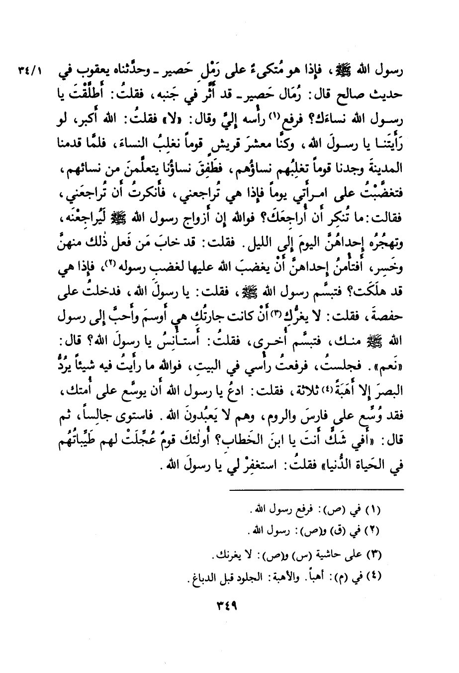 رَسُولِ اللهِ صَلَّى اللهُ عَلَيْهِ وَسَلَّمَ، فَإِذَا هُوَ مُتَّكِئٌ عَلَى رَمْلِ حَصِيرٍ - وحَدَّثَنَاهُ يَعْقُوبُ فِي حَدِيثِ صَالِحٍ قَالَ: رُمَالِ حَصِيرٍ - قَدْ أَثَّرَ فِي جَنْبِهِ، فَقُلْتُ: أَطَلَّقْتَ يَا رَسُولَ اللهِ نِسَاءَكَ؟ فَرَفَعَ (١) رَأْسَهُ إِلَيَّ وَقَالَ: " لَا " فَقُلْتُ: اللهُ أَكْبَرُ، لَوْ رَأَيْتَنَا يَا رَسُولَ اللهِ، وَكُنَّا مَعْشَرَ قُرَيْشٍ قَوْمًا نَغْلِبُ النِّسَاءَ، فَلَمَّا قَدِمْنَا الْمَدِينَةَ وَجَدْنَا قَوْمًا تَغْلِبُهُمْ نِسَاؤُهُمْ، فَطَفِقَ نِسَاؤُنَا يَتَعَلَّمْنَ مِنْ نِسَائِهِمْ، فَتَغَضَّبْتُ عَلَى امْرَأَتِي يَوْمًا فَإِذَا هِيَ تُرَاجِعُنِي، فَأَنْكَرْتُ أَنْ تُرَاجِعَنِي، فَقَالَتْ: مَا تُنْكِرُ أَنْ أُرَاجِعَكَ؟ فَوَاللهِ إِنَّ أَزْوَاجَ رَسُولِ اللهِ صَلَّى اللهُ عَلَيْهِ وَسَلَّمَ لَيُرَاجِعْنَهُ، وَتَهْجُرُهُ إِحْدَاهُنَّ الْيَوْمَ إِلَى اللَّيْلِ. فَقُلْتُ: قَدْ خَابَ مَنْ فَعَلَ ذَلِكَ مِنْهُنَّ وَخَسِرَ، أَفَتَأْمَنُ إِحْدَاهُنَّ أَنْ يَغْضَبَ اللهُ عَلَيْهَا لِغَضَبِ رَسُولِهِ (٢) ، فَإِذَا هِيَ قَدْ هَلَكَتْ؟ فَتَبَسَّمَ رَسُولُ اللهِ صَلَّى اللهُ عَلَيْهِ وَسَلَّمَ، فَقُلْتُ: يَا رَسُولَ اللهِ، فَدَخَلْتُ عَلَى حَفْصَةَ، فَقُلْتُ: لَا يَغُرُّكِ (٣) أَنْ كَانَتْ جَارَتُكِ هِيَ أَوْسَمَ وَأَحَبَّ إِلَى رَسُولِ اللهِ صَلَّى اللهُ عَلَيْهِ وَسَلَّمَ مِنْكِ، فَتَبَسَّمَ أُخْرَى، فَقُلْتُ: أَسْتَأْنِسُ يَا رَسُولَ اللهِ؟ قَالَ: " نَعَمْ ". فَجَلَسْتُ، فَرَفَعْتُ رَأْسِي فِي الْبَيْتِ، فَوَاللهِ مَا رَأَيْتُ فِيهِ شَيْئًا يَرُدُّ الْبَصَرَ إِلَّا أَهَبَةً (٤) ثَلَاثَةً، فَقُلْتُ: ادْعُ يَا رَسُولَ اللهِ أَنْ يُوَسِّعَ عَلَى أُمَّتِكَ، فَقَدْ وُسِّعَ عَلَى فَارِسَ وَالرُّومِ، وَهُمْ لَا يَعْبُدُونَ اللهَ. فَاسْتَوَى جَالِسًا، ثُمَّ قَالَ: " أَفِي شَكٍّ أَنْتَ يَا ابْنَ الْخَطَّابِ؟ أُولَئِكَ قَوْمٌ عُجِّلَتْ لَهُمْ طَيِّبَاتُهُمْ فِي الْحَيَاةِ الدُّنْيَا " فَقُلْتُ: اسْتَغْفِرْ لِي يَا رَسُولَ اللهِ.