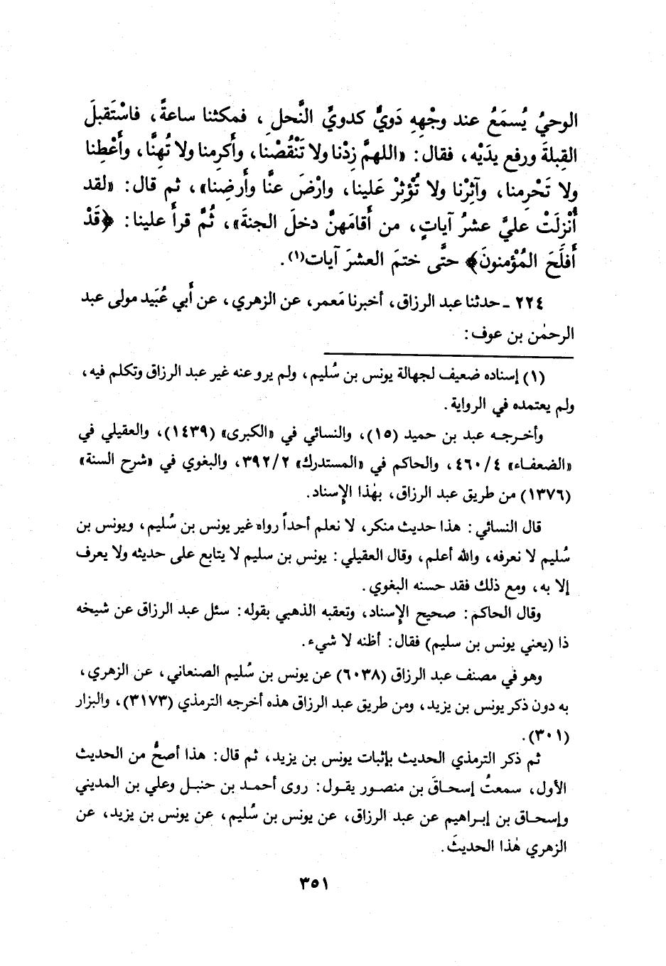 ثم ذكر الترمذي الحديث بإثبات يونس بن يزيد، ثم قال: هذا أصحُّ من الحديث الأول، سمعتُ إسحاقَ بن منصور يقول: روى أحمد بن حنبل وعلي بن المديني وإسحاق بن إبراهيم عن عبد الرزاق، عن يونس بن سُليم، عن يونس بن يزيد، عن الزهري هذا الحديثَ.