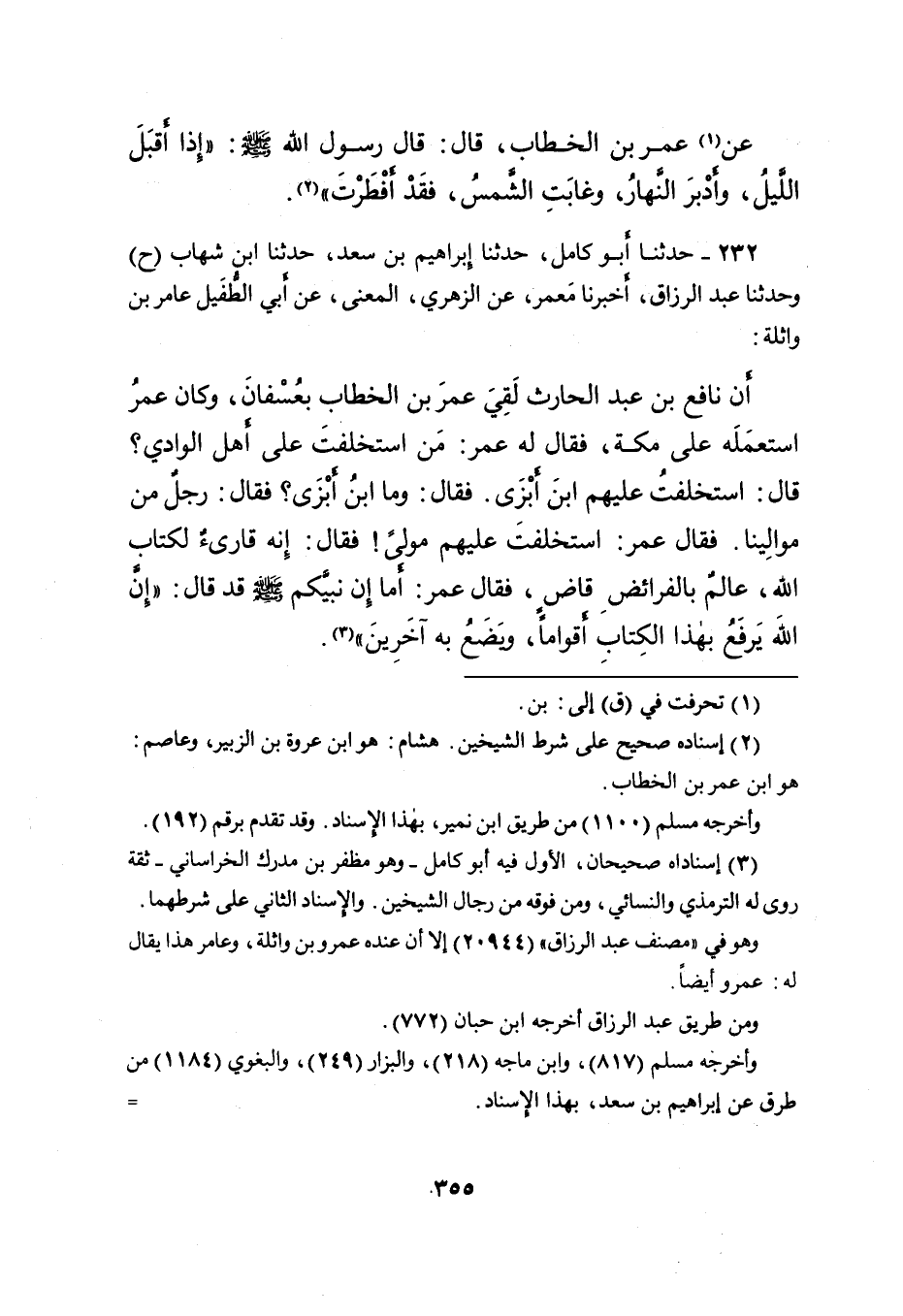 أَنَّ نَافِعَ بْنَ عَبْدِ الْحَارِثِ لَقِيَ عُمَرَ بْنَ الْخَطَّابِ بِعُسْفَانَ، وَكَانَ عُمَرُ اسْتَعْمَلَهُ عَلَى مَكَّةَ، فَقَالَ لَهُ عُمَرُ: مَنِ اسْتَخْلَفْتَ عَلَى أَهْلِ الْوَادِي؟ قَالَ: اسْتَخْلَفْتُ عَلَيْهِمُ ابْنَ أَبْزَى. فقَالَ: وَمَا ابْنُ أَبْزَى؟ فَقَالَ: رَجُلٌ مِنْ مَوَالِينَا. فَقَالَ عُمَرُ: اسْتَخْلَفْتَ عَلَيْهِمْ مَوْلًى! فَقَالَ: إِنَّهُ قَارِئٌ لِكِتَابِ اللهِ، عَالِمٌ بِالْفَرَائِضِ قَاضٍ، فَقَالَ عُمَرُ: أَمَا إِنَّ نَبِيَّكُمْ صَلَّى اللهُ عَلَيْهِ وَسَلَّمَ قَدْ قَالَ: " إِنَّ اللهَ يَرْفَعُ بِهَذَا الْكِتَابِ أَقْوَامًا، وَيَضَعُ بِهِ آخَرِينَ " (٣) .