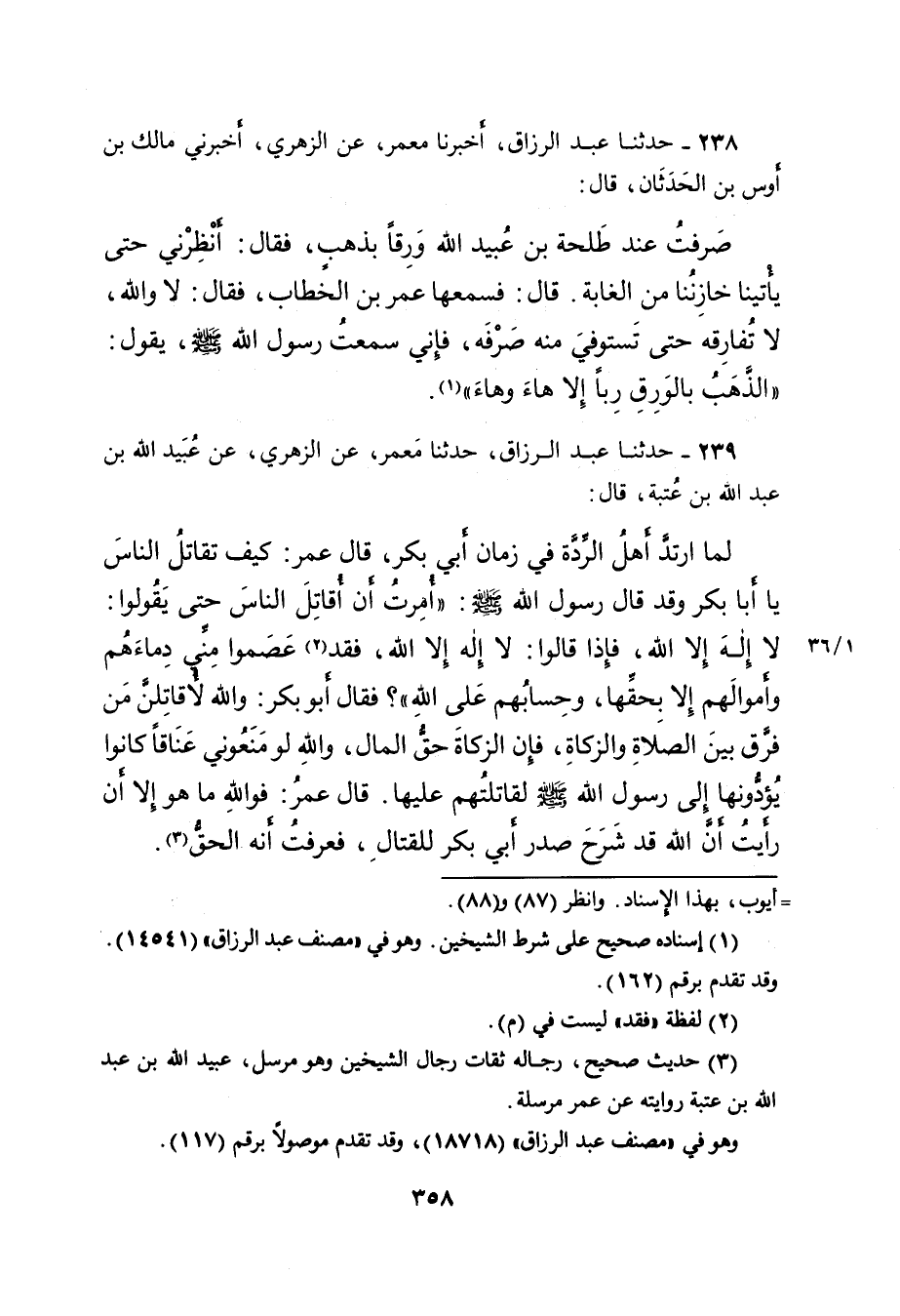 ٢٣٨ - حَدَّثَنَا عَبْدُ الرَّزَّاقِ، أَخْبَرَنَا مَعْمَرٌ، عَنِ الزُّهْرِيِّ، أَخْبَرَنِي مَالِكُ بْنُ أَوْسِ بْنِ الْحَدَثَانِ، قَالَ: