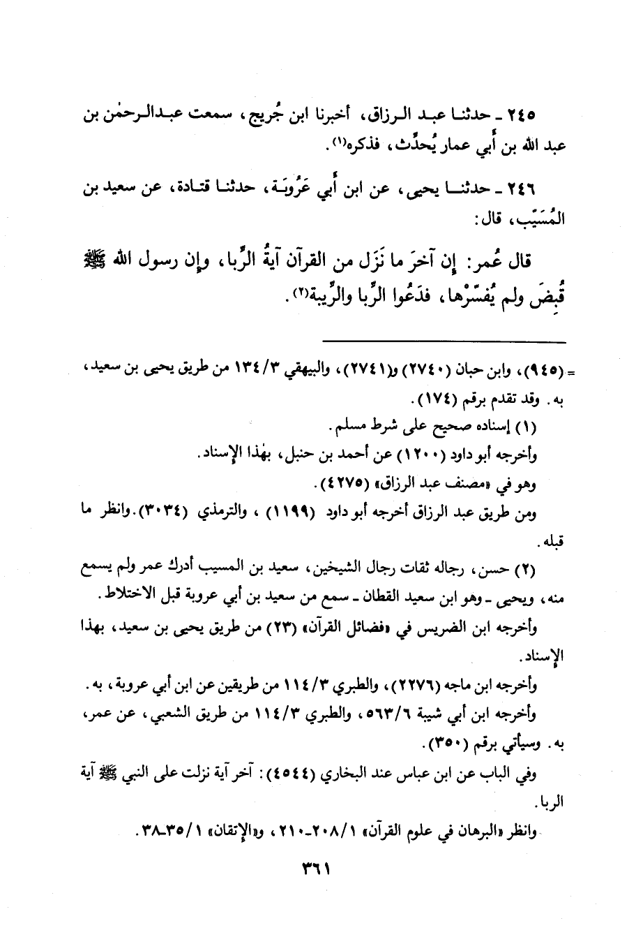 قَالَ عُمَرُ: إِنَّ آخِرَ مَا نَزَلَ مِنَ الْقُرْآنِ آيَةُ الرِّبَا، وَإِنَّ رَسُولَ اللهِ صَلَّى اللهُ عَلَيْهِ وَسَلَّمَ قُبِضَ وَلَمْ يُفَسِّرْهَا، فَدَعُوا الرِّبَا وَالرِّيبَةَ (٢) .