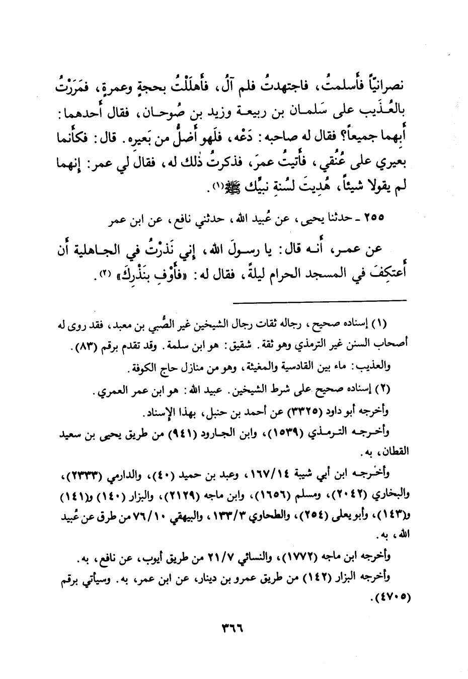 عَنْ عُمَرَ، أَنَّهُ قَالَ: يَا رَسُولَ اللهِ، إِنِّي نَذَرْتُ فِي الْجَاهِلِيَّةِ أَنْ أَعْتَكِفَ فِي الْمَسْجِدِ الْحَرَامِ لَيْلَةً، فَقَالَ لَهُ: " فَأَوْفِ بِنَذْرِكَ " (٢) .