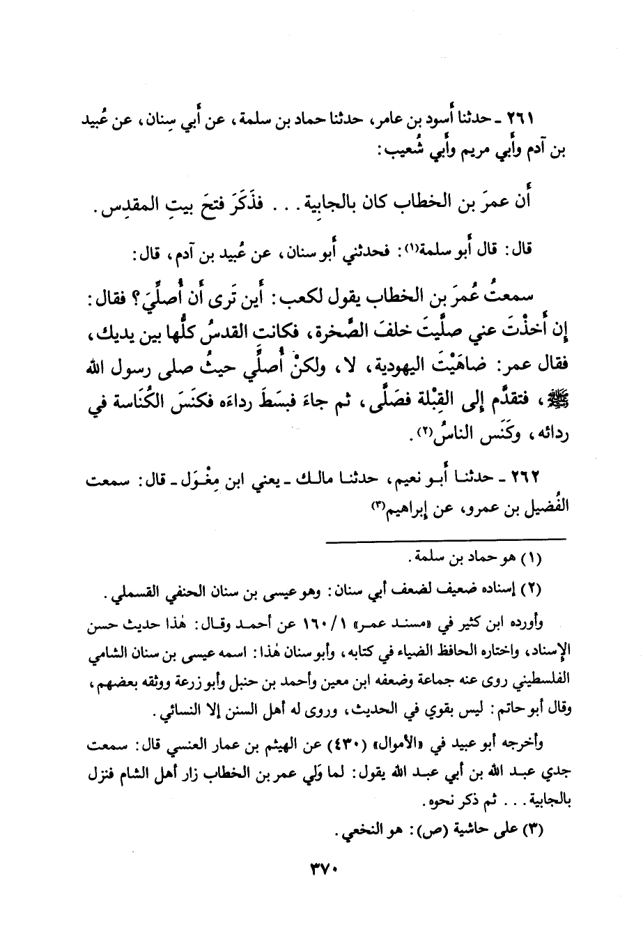 سَمِعْتُ عُمَرَ بْنَ الْخَطَّابِ يَقُولُ لِكَعْبٍ: أَيْنَ تُرَى أَنْ أُصَلِّيَ؟ فَقَالَ: إِنْ أَخَذْتَ عَنِّي صَلَّيْتَ خَلْفَ الصَّخْرَةِ، فَكَانَتِ الْقُدْسُ كُلُّهَا بَيْنَ يَدَيْكَ، فَقَالَ عُمَرُ: ضَاهَيْتَ الْيَهُودِيَّةَ، لَا، وَلَكِنْ أُصَلِّي حَيْثُ صَلَّى رَسُولُ اللهِ صَلَّى اللهُ عَلَيْهِ وَسَلَّمَ، فَتَقَدَّمَ إِلَى الْقِبْلَةِ فَصَلَّى، ثُمَّ جَاءَ فَبَسَطَ رِدَاءَهُ فَكَنَسَ الْكُنَاسَةَ فِي رِدَائِهِ، وَكَنَسَ النَّاسُ (٢) .