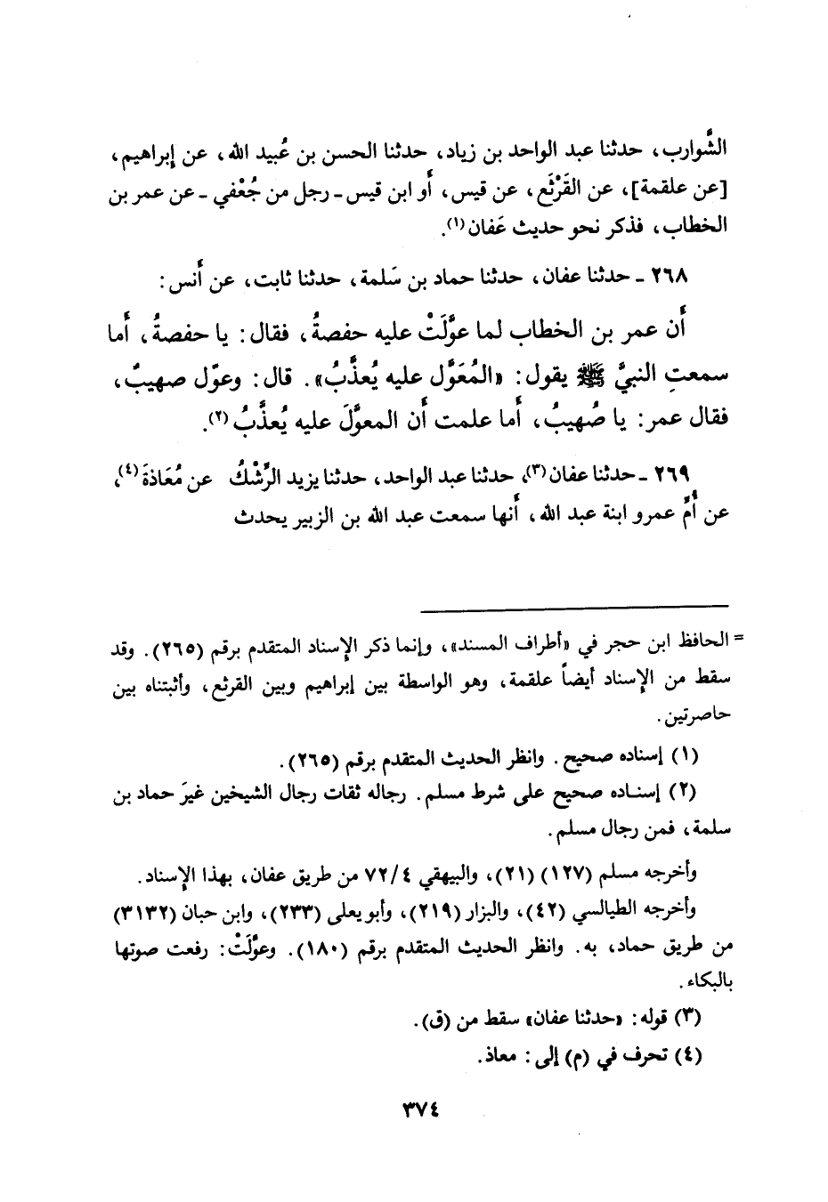 ٢٦٩ - حَدَّثَنَا عَفَّانُ (٣) ، حَدَّثَنَا عَبْدُ الْوَاحِدِ، حَدَّثَنَا يَزِيدُ الرِّشْكُ، عَنْ مُعَاذَةَ (٤) ، عَنْ أُمِّ عَمْرٍو ابْنَةِ عَبْدِ اللهِ، أَنَّهَا سَمِعَتْ عَبْدَ اللهِ بْنَ الزُّبَيْرِ يُحَدِّثُ