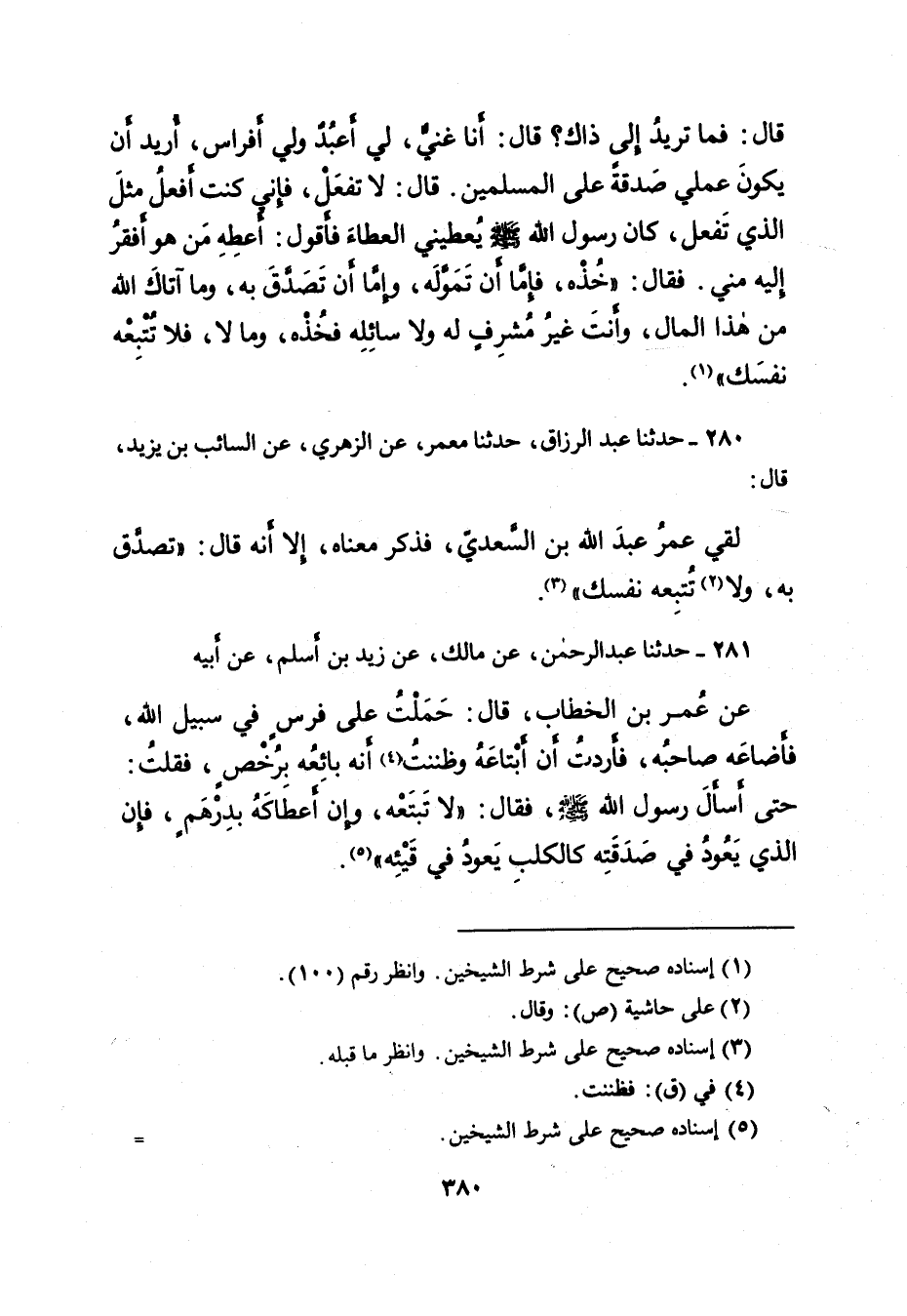 قَالَ: فَمَا تُرِيدُ إِلَى ذَاكَ؟ قَالَ: أَنَا غَنِيٌّ، لِي أَعْبُدٌ وَلِي أَفْرَاسٌ، أُرِيدُ أَنْ يَكُونَ عَمَلِي صَدَقَةً عَلَى الْمُسْلِمِينَ. قَالَ: لَا تَفْعَلْ، فَإِنِّي كُنْتُ أَفْعَلُ مِثْلَ الَّذِي تَفْعَلُ، كَانَ رَسُولُ اللهِ صَلَّى اللهُ عَلَيْهِ وَسَلَّمَ يُعْطِينِي الْعَطَاءَ فَأَقُولُ: أَعْطِهِ مَنْ هُوَ أَفْقَرُ إِلَيْهِ مِنِّي. فَقَالَ: " خُذْهُ، فَإِمَّا أَنْ تَمَوَّلَهُ، وَإِمَّا أَنْ تَصَدَّقَ بِهِ، وَمَا آتَاكَ اللهُ مِنْ هَذَا الْمَالِ، وَأَنْتَ غَيْرُ مُشْرِفٍ لَهُ وَلا سَائِلِهِ فَخُذْهُ، وَمَا لَا فَلا تُتْبِعْهُ نَفْسَكَ " (١) .
