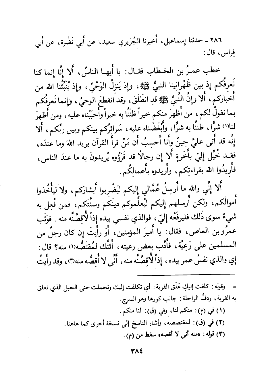 أَلا إِنِّي وَاللهِ مَا أُرْسِلُ عُمَّالِي إِلَيْكُمْ لِيَضْرِبُوا أَبْشَارَكُمْ، وَلا لِيَأْخُذُوا أَمْوَالَكُمْ، وَلَكِنْ أُرْسِلُهُمْ إِلَيْكُمْ لِيُعَلِّمُوكُمْ دِينَكُمْ وَسُنَّتَكُمْ، فَمَنْ فُعِلَ بِهِ شَيْءٌ سِوَى ذَلِكَ فَلْيَرْفَعْهُ إِلَيَّ، فَوَالَّذِي نَفْسِي بِيَدِهِ إِذَاً لَأُقِصَّنَّهُ مِنْهُ، فَوَثَبَ عَمْرُو بْنُ الْعَاصِ، فَقَالَ: يَا أَمِيرَ الْمُؤْمِنِينَ، أَوَرَأَيْتَ إِنْ كَانَ رَجُلٌ مِنَ الْمُسْلِمِينَ عَلَى رَعِيَّةٍ، فَأَدَّبَ بَعْضَ رَعِيَّتِهِ، أَئِنَّكَ لَمُقْتَصُّهُ (٢) مِنْهُ؟ قَالَ: إِي وَالَّذِي نَفْسُ عُمَرَ بِيَدِهِ، إِذَاً لَأُقِصَّنَّهُ مِنْهُ، أَنَّى لا أُقِصَّنَّهُ مِنْهُ (٣) ، وَقَدْ رَأَيْتُ