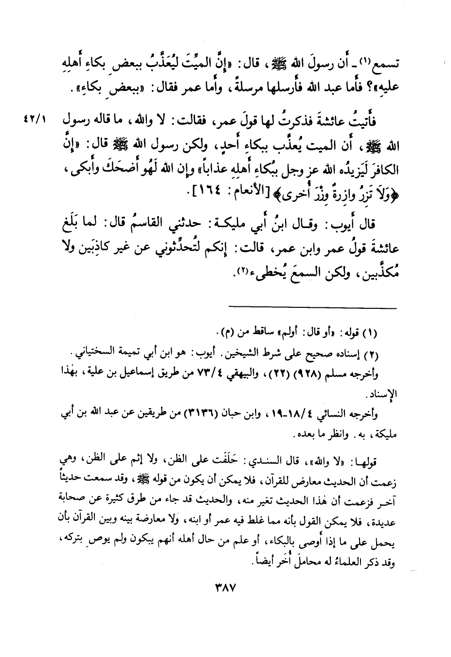 تَسْمَعْ (١) - أَنَّ رَسُولَ اللهِ صَلَّى اللهُ عَلَيْهِ وَسَلَّمَ، قَالَ: " إِنَّ الْمَيِّتَ لَيُعَذَّبُ بِبَعْضِ بُكَاءِ أَهْلِهِ عَلَيْهِ "؟ فَأَمَّا عَبْدُ اللهِ فَأَرْسَلَهَا مُرْسَلَةً، وَأَمَّا عُمَرُ فَقَالَ: " بِبَعْضِ بُكَاءِ ".