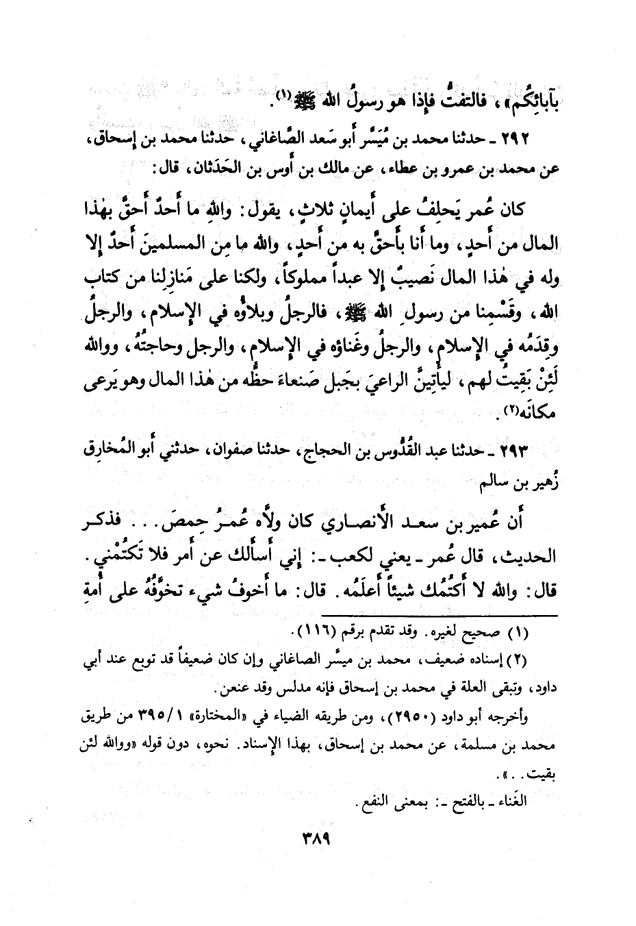 ٢٩٢ - حَدَّثَنَا مُحَمَّدُ بْنُ مُيَسَّرٍ أَبُو سَعْدٍ الصَّاغَانِيُّ، حَدَّثَنَا مُحَمَّدُ بْنُ إِسْحَاقَ، عَنْ مُحَمَّدِ بْنِ عَمْرِو بْنِ عَطَاءٍ، عَنْ مَالِكِ بْنِ أَوْسِ بْنِ الْحَدَثَانِ، قَالَ: