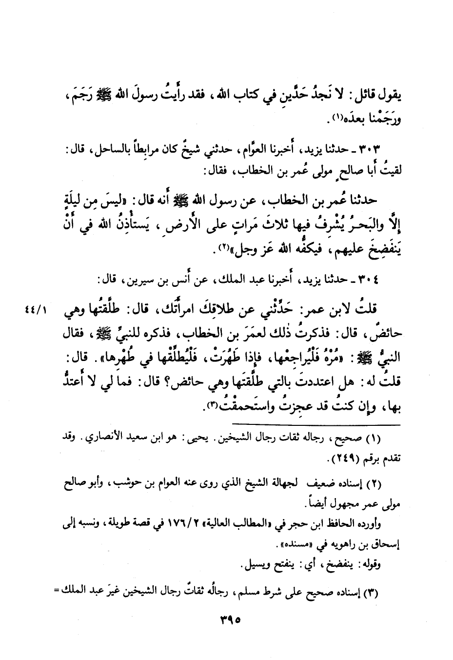 قُلْتُ لِابْنِ عُمَرَ: حَدِّثْنِي عَنْ طَلاقِكَ امْرَأَتَكَ، قَالَ: طَلَّقْتُهَا وَهِيَ حَائِضٌ، قَالَ: فَذَكَرْتُ ذَلِكَ لِعُمَرَ بْنِ الْخَطَّابِ، فَذَكَرَهُ لِلنَّبِيِّ صَلَّى اللهُ عَلَيْهِ وَسَلَّمَ، فَقَالَ النَّبِيُّ صَلَّى اللهُ عَلَيْهِ وَسَلَّمَ: " مُرْهُ فَلْيُرَاجِعْهَا، فَإِذَا طَهُرَتْ، فَلْيُطَلِّقْهَا فِي طُهْرِهَا ". قَالَ: قُلْتُ لَهُ: هَلِ اعْتَدَدْتَ بِالَّتِي طَلَّقْتَهَا وَهِيَ حَائِضٌ؟ قَالَ: فَمَا لِي لَا أَعْتَدُّ بِهَا، وَإِنْ كُنْتُ قَدْ عَجِزْتُ وَاسْتَحْمَقْتُ (٣) .