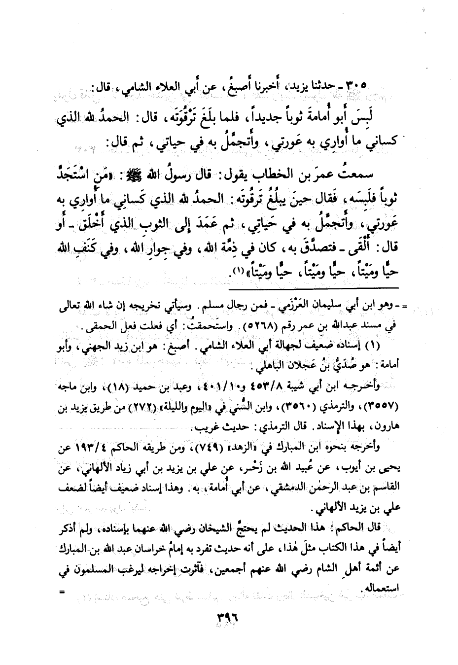 سَمِعْتُ عُمَرَ بْنَ الْخَطَّابِ يَقُولُ: قَالَ رَسُولُ اللهِ صَلَّى اللهُ عَلَيْهِ وَسَلَّمَ: " مَنِ اسْتَجَدَّ ثَوْبًا فَلَبِسَهُ، فَقَالَ حِينَ يَبْلُغُ تَرْقُوَتَهُ: الْحَمْدُ لِلَّهِ الَّذِي كَسَانِي مَا أُوَارِي بِهِ عَوْرَتِي، وَأَتَجَمَّلُ بِهِ فِي حَيَاتِي، ثُمَّ عَمَدَ إِلَى الثَّوْبِ الَّذِي أَخْلَقَ - أَوْ قَالَ: أَلْقَى - فَتَصَدَّقَ بِهِ، كَانَ فِي ذِمَّةِ اللهِ، وَفِي جِوَارِ اللهِ، وَفِي كَنَفِ اللهِ حَيًّا وَمَيِّتًا، حَيًّا وَمَيِّتًا، حَيًّا وَمَيِّتًا " (١) .