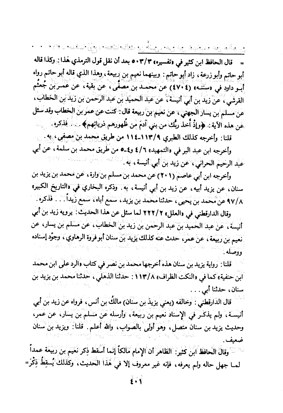 = قال الحافظ ابن كثير في " تفسيره " ٣ / ٥٠٣ بعد أن نقل قوله الترمذي هذا: وكذا قاله أبو حاتم وأبو زرعة، زاد أبو حاتم: وبينهما نعيم بن ربيعة، وهذا الذي قاله أبو حاتم رواه أبو داود في " سننه " (٤٧٠٤) عن محمد بن مصفَّى، عن بقية، عن عمران جُعثُم القرشي، عن زيد بن أبي أنيسة، عن عبد الحميد بن عبد الرحمن بن زيد بن الخطاب، عن مسلم بن يسار الجهني، عن نعيم بن ربيعة قال: كنت عند عمر بن الخطاب وقد سئل عن هذه الآية: {وَإِذْ أَخَذَ رَبُّكَ مِنْ بَنِي آدَمَ مِنْ ظُهُورِهِمْ ذُرِّيَّاتِهِم} ... فذكره.