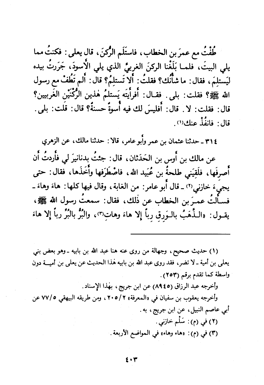 عَنْ مَالِكِ بْنِ أَوْسِ بْنِ الْحَدَثَانِ، قَالَ: جِئْتُ بِدَنَانِيرَ لِي فَأَرَدْتُ أَنْ أَصْرِفَهَا، فَلَقِيَنِي طَلْحَةُ بْنُ عُبَيْدِ اللهِ، فَاصْطَرَفَهَا وَأَخَذَهَا، فَقَالَ: حَتَّى يَجِيءَ خَازِنِي (٢) - قَالَ أَبُو عَامِرٍ: مِنَ الْغَابَةِ، وَقَالَ فِيهَا كُلِّهَا: هَاءَ وَهَاءَ - فَسَأَلْتُ عُمَرَ بْنَ الْخَطَّابِ عَنْ ذَلِكَ، فَقَالَ: سَمِعْتُ رَسُولَ اللهِ صَلَّى اللهُ عَلَيْهِ وَسَلَّمَ، يَقُولُ: " الذَّهَبُ بِالْوَرِقِ رِبًا إِلَّا هَاءَ وَهَاتِ (٣) ، وَالْبُرُّ بِالْبُرِّ رِبًا إِلَّا هَاءَ