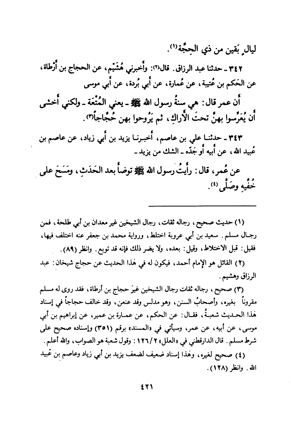 ٣٤٢ - حَدَّثَنَا عَبْدُ الرَّزَّاقِ. قَالَ (٢) : وَأَخْبَرَنِي هُشَيْمٌ، عَنِ الْحَجَّاجِ بْنِ أَرْطَاةَ، عَنِ الْحَكَمِ بْنِ عُتَيْبَةَ، عَنْ عُمَارَةَ، عَنْ أَبِي بُرْدَةَ، عَنْ أَبِي مُوسَى