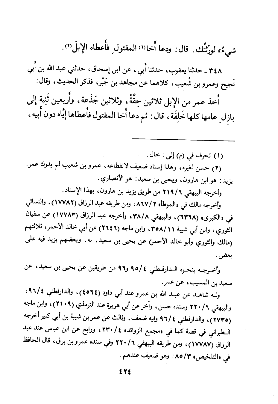 أَخَذَ عُمَرُ مِنَ الْإِبِلِ ثَلاثِينَ حِقَّةً، وَثَلاثِينَ جَذَعَةً، وَأَرْبَعِينَ ثَنِيَّةً إِلَى بَازِلِ عَامِهَا كُلُّهَا خَلِفَةٌ، قَالَ: ثُمَّ دَعَا أَخَا الْمَقْتُولِ فَأَعْطَاهَا إِيَّاهُ دُونَ أَبِيهِ،