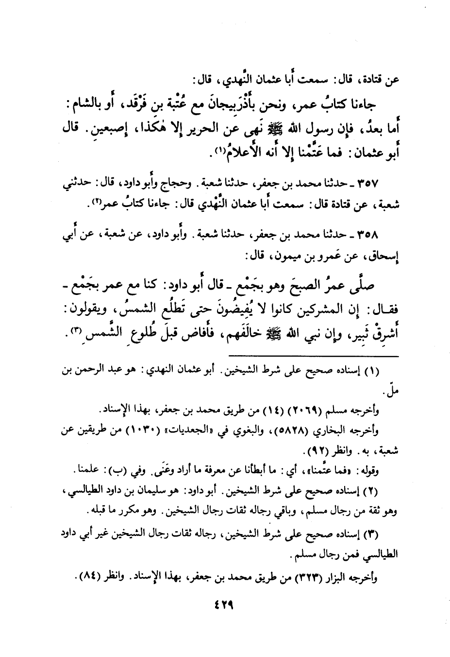 ٣٥٧ - حَدَّثَنَا مُحَمَّدُ بْنُ جَعْفَرٍ، حَدَّثَنَا شُعْبَةُ. وَحَجَّاجٌ وَأَبُو دَاوُدَ، قَالَ: حَدَّثَنِي شُعْبَةُ، عَنْ قَتَادَةَ قَالَ: سَمِعْتُ أَبَا عُثْمَانَ النَّهْدِيَّ قَالَ: جَاءَنَا كِتَابُ عُمَرَ (٢) .