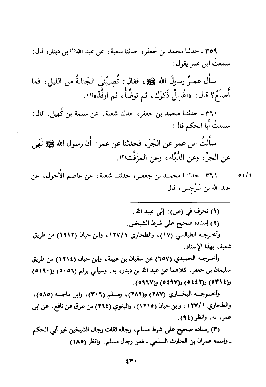 ٣٥٩ - حَدَّثَنَا مُحَمَّدُ بْنُ جَعْفَرٍ، حَدَّثَنَا شُعْبَةُ، عَنْ عَبْدِ اللهِ (١) بْنِ دِينَارٍ، قَالَ: سَمِعْتُ ابْنَ عُمَرَ يَقُولُ: