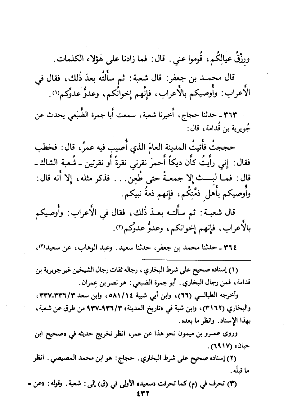 قَالَ مُحَمَّدُ بْنُ جَعْفَرٍ: قَالَ شُعْبَةُ: ثُمَّ سَأَلْتُهُ بَعْدَ ذَلِكَ، فَقَالَ فِي الْأَعْرَابِ: وَأُوصِيكُمْ بِالْأَعْرَابِ فَإِنَّهُمْ إِخْوَانُكُمْ، وَعَدُوُّ عَدُوِّكُمْ (١) .