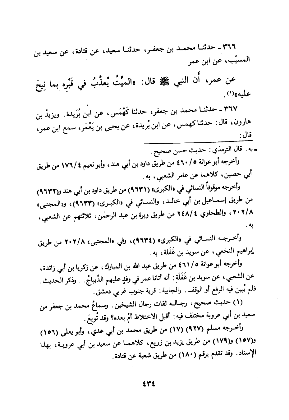 عَنْ عُمَرَ، أَنَّ النَّبِيَّ صَلَّى اللهُ عَلَيْهِ وَسَلَّمَ قَالَ: " الْمَيِّتُ يُعَذَّبُ فِي قَبْرِهِ بِمَا نِيحَ عَلَيْهِ " (١) .