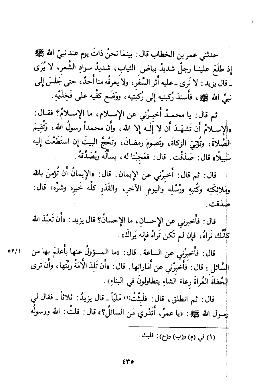 حَدَّثَنِي عُمَرُ بْنُ الْخَطَّابِ قَالَ: بَيْنَمَا نَحْنُ ذَاتَ يَوْمٍ عِنْدَ نَبِيِّ اللهِ صَلَّى اللهُ عَلَيْهِ وَسَلَّمَ إِذْ طَلَعَ عَلَيْنَا رَجُلٌ شَدِيدُ بَيَاضِ الثِّيَابِ، شَدِيدُ سَوَادِ الشَّعَرِ، لَا يُرَى - قَالَ يَزِيدُ: لَا نَرَى - عَلَيْهِ أَثَرَ السَّفَرِ، وَلا يَعْرِفُهُ مِنَّا أَحَدٌ، حَتَّى جَلَسَ إِلَى نَبِيِّ اللهِ صَلَّى اللهُ عَلَيْهِ وَسَلَّمَ، فَأَسْنَدَ رُكْبَتَيْهِ إِلَى رُكْبَتَيْهِ، وَوَضَعَ كَفَّيْهِ عَلَى فَخِذَيْهِ.
