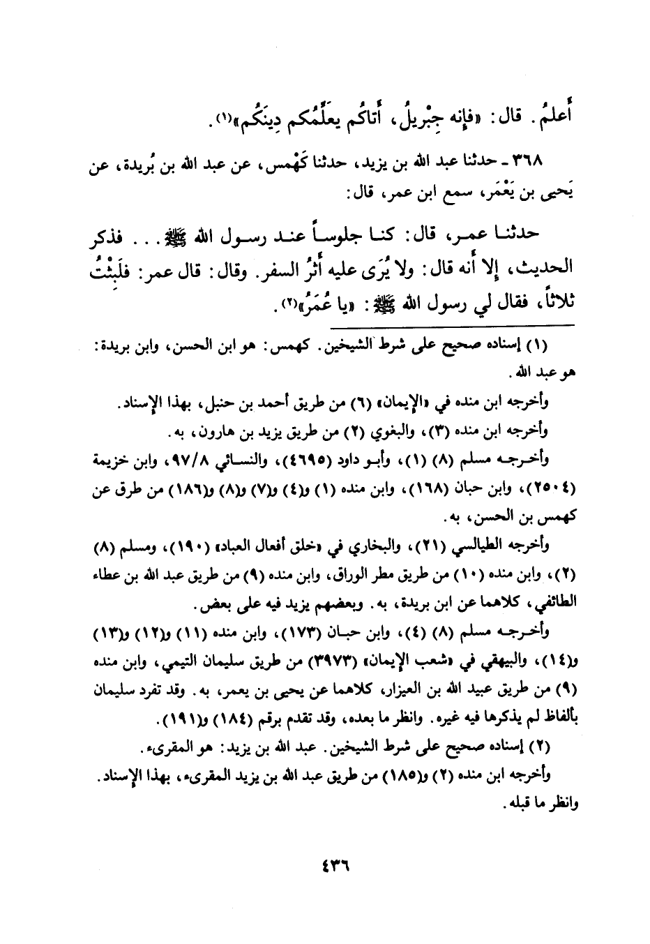 حَدَّثَنَا عُمَرُ، قَالَ: كُنَّا جُلُوسًا عِنْدَ رَسُولِ اللهِ صَلَّى اللهُ عَلَيْهِ وَسَلَّمَ ... فَذَكَرَ الْحَدِيثَ، إِلَّا أَنَّهُ قَالَ: وَلا يُرَى عَلَيْهِ أَثَرُ السَّفَرِ. وَقَالَ: قَالَ عُمَرُ: فَلَبِثْتُ ثَلاثًا، فَقَالَ لِي رَسُولُ اللهِ صَلَّى اللهُ عَلَيْهِ وَسَلَّمَ: " يَا عُمَرُ (٢) .