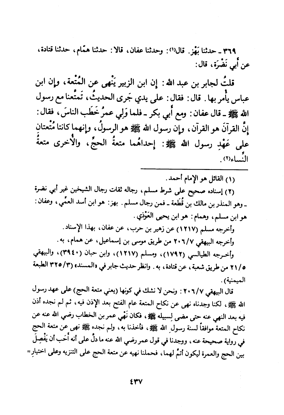 قُلْتُ لِجَابِرِ بْنِ عَبْدِ اللهِ: إِنَّ ابْنَ الزُّبَيْرِ يَنْهَى عَنِ الْمُتْعَةِ، وَإِنَّ ابْنَ عَبَّاسٍ يَأْمُرُ بِهَا. قَالَ: فَقَالَ لِي: عَلَى يَدِي جَرَى الْحَدِيثُ، تَمَتَّعْنَا مَعَ رَسُولِ اللهِ صَلَّى اللهُ عَلَيْهِ وَسَلَّمَ - قَالَ عَفَّانُ: وَمَعَ أَبِي بَكْرٍ - فَلَمَّا وَلِيَ عُمَرُ خَطَبَ النَّاسَ، فَقَالَ: إِنَّ الْقُرْآنَ هُوَ الْقُرْآنُ، وَإِنَّ رَسُولَ اللهِ صَلَّى اللهُ عَلَيْهِ وَسَلَّمَ هُوَ الرَّسُولُ، وَإِنَّهُمَا كَانَتَا مُتْعَتَانِ عَلَى عَهْدِ رَسُولِ اللهِ صَلَّى اللهُ عَلَيْهِ وَسَلَّمَ: إِحْدَاهُمَا مُتْعَةُ الْحَجِّ، وَالْأُخْرَى مُتْعَةُ النِّسَاءِ (٢) .