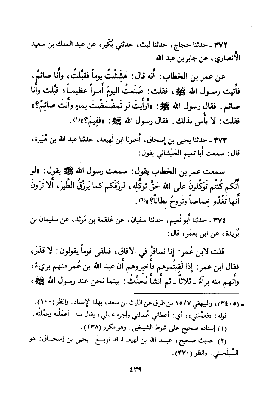 سَمِعْتُ عُمَرَ بْنَ الْخَطَّابِ يَقُولُ: سَمِعْتُ رَسُولَ اللهِ صَلَّى اللهُ عَلَيْهِ وَسَلَّمَ يَقُولُ: " لَوْ أَنَّكُمْ كُنْتُمْ تَوَكَّلُونَ عَلَى اللهِ حَقَّ تَوَكُّلِهِ، لَرَزَقَكُمْ كَمَا يَرْزُقُ الطَّيْرَ، أَلا تَرَوْنَ أَنَّهَا تَغْدُو خِمَاصًا وَتَرُوحُ بِطَانًا؟ " (٢) .