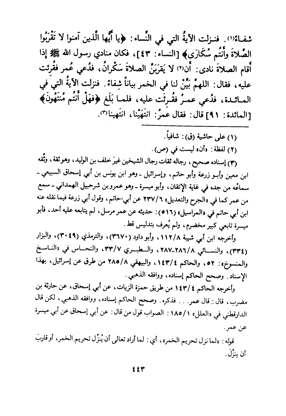 شِفَاءً (١) . فَنَزَلَتِ الْآيَةُ الَّتِي فِي سُورَةِ النِّسَاءِ: {يَا أَيُّهَا الَّذِينَ آمَنُوا لَا تَقْرَبُوا الصَّلَاةَ وَأَنْتُمْ سُكَارَى} [النساء: ٤٣] ، فَكَانَ مُنَادِي رَسُولِ اللهِ صَلَّى اللهُ عَلَيْهِ وَسَلَّمَ إِذَا أَقَامَ الصَّلاةَ نَادَى: أَنْ (٢) لَا يَقْرَبَنَّ الصَّلاةَ سَكْرَانُ، فَدُعِيَ عُمَرُ فَقُرِئَتْ عَلَيْهِ، فَقَالَ: اللهُمَّ بَيِّنْ لَنَا فِي الْخَمْرِ بَيَانًا شِفَاءً. فَنَزَلَتِ الْآيَةُ الَّتِي فِي الْمَائِدَةِ، فَدُعِيَ عُمَرُ فَقُرِئَتْ عَلَيْهِ، فَلَمَّا بَلَغَ {فَهَلْ أَنْتُمْ مُّنْتَهُونَ} [المائدة: ٩١] قَالَ: فَقَالَ عُمَرُ: انْتَهَيْنَا، انْتَهَيْنَا (٣) .