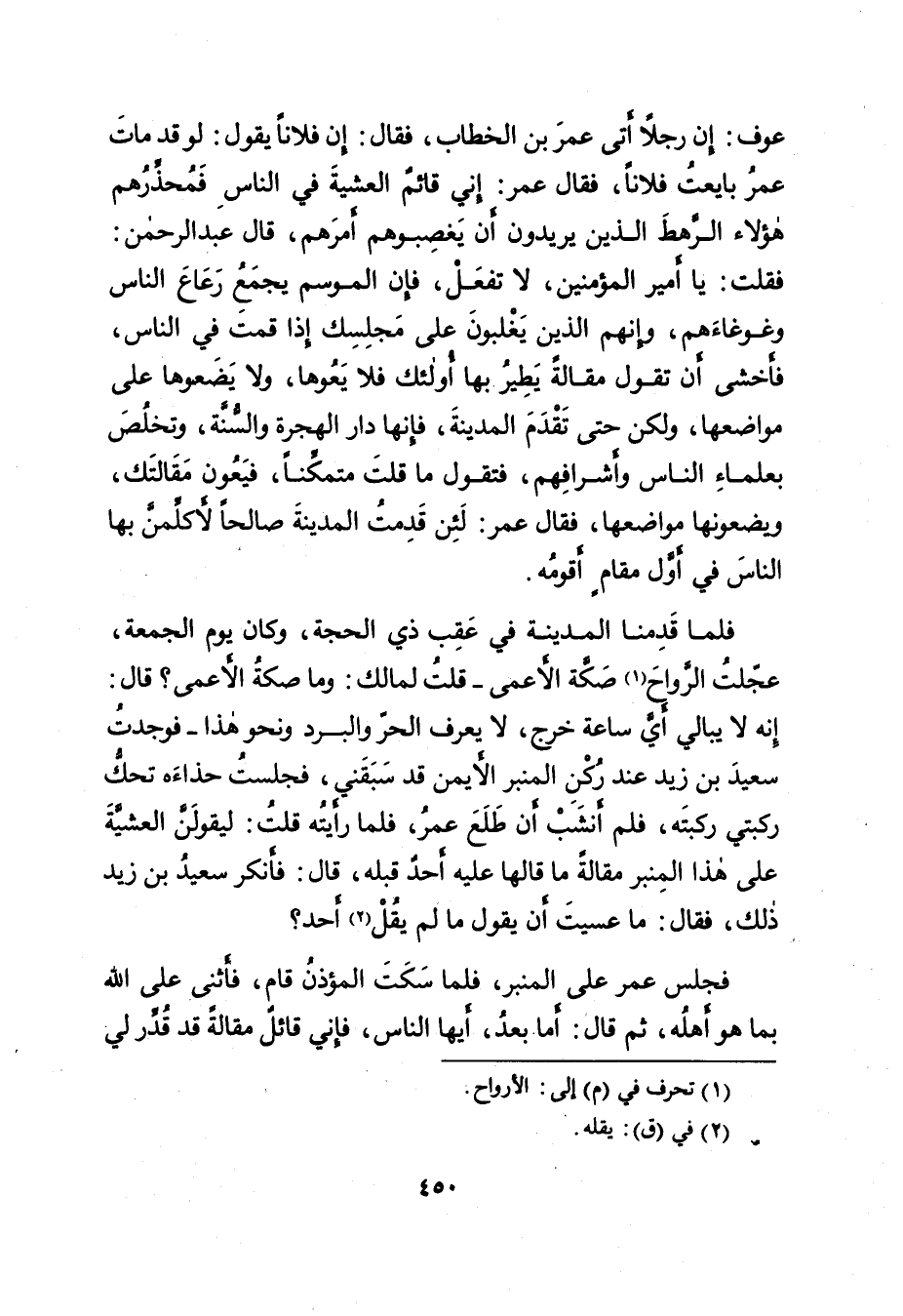 عَوْفٍ: إِنَّ رَجُلًا أَتَى عُمَرَ بْنَ الْخَطَّابِ، فَقَالَ: إِنَّ فُلَانًا يَقُولُ: لَوْ قَدْ مَاتَ عُمَرُ بَايَعْتُ فُلَانًا، فَقَالَ عُمَرُ: إِنِّي قَائِمٌ الْعَشِيَّةَ فِي النَّاسِ فَمُحَذِّرُهُمْ هَؤُلَاءِ الرَّهْطَ الَّذِينَ يُرِيدُونَ أَنْ يَغْصِبُوهُمْ أَمْرَهُمْ، قَالَ عَبْدُ الرَّحْمَنِ: فَقُلْتُ: يَا أَمِيرَ الْمُؤْمِنِينَ، لَا تَفْعَلْ، فَإِنَّ الْمَوْسِمَ يَجْمَعُ رَعَاعَ النَّاسِ وَغَوْغَاءَهُمْ، وَإِنَّهُمُ الَّذِينَ يَغْلِبُونَ عَلَى مَجْلِسِكَ إِذَا قُمْتَ فِي النَّاسِ، فَأَخْشَى أَنْ تَقُولَ مَقَالَةً يَطِيرُ بِهَا أُولَئِكَ فَلَا يَعُوهَا، وَلَا يَضَعُوهَا عَلَى مَوَاضِعِهَا، وَلَكِنْ حَتَّى تَقْدَمَ الْمَدِينَةَ، فَإِنَّهَا دَارُ الْهِجْرَةِ وَالسُّنَّةِ، وَتَخْلُصَ بِعُلَمَاءِ النَّاسِ وَأَشْرَافِهِمْ، فَتَقُولَ مَا قُلْتَ مُتَمَكِّنًا، فَيَعُونَ مَقَالَتَكَ، وَيَضَعُونَهَا مَوَاضِعَهَا، فَقَالَ عُمَرُ: لَئِنْ قَدِمْتُ الْمَدِينَةَ صَالِحًا لَأُكَلِّمَنَّ بِهَا النَّاسَ فِي أَوَّلِ مَقَامٍ أَقُومُهُ.