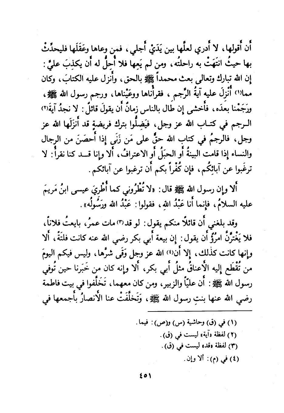 أَنْ أَقُولَهَا، لَا أَدْرِي لَعَلَّهَا بَيْنَ يَدَيْ أَجَلِي، فَمَنْ وَعَاهَا وَعَقَلَهَا فَلْيُحَدِّثْ بِهَا حَيْثُ انْتَهَتْ بِهِ رَاحِلَتُهُ، وَمَنْ لَمْ يَعِهَا فَلَا أُحِلُّ لَهُ أَنْ يَكْذِبَ عَلَيَّ: إِنَّ اللهَ تَبَارَكَ وَتَعَالَى بَعَثَ مُحَمَّدًا صَلَّى اللهُ عَلَيْهِ وَسَلَّمَ بِالْحَقِّ، وَأَنْزَلَ عَلَيْهِ الْكِتَابَ، وَكَانَ مِمَّا (١) أَنْزَلَ عَلَيْهِ آيَةُ الرَّجْمِ، فَقَرَأْنَاهَا وَوَعَيْنَاهَا، وَرَجَمَ رَسُولُ اللهِ صَلَّى اللهُ عَلَيْهِ وَسَلَّمَ وَرَجَمْنَا بَعْدَهُ، فَأَخْشَى إِنْ طَالَ بِالنَّاسِ زَمَانٌ أَنْ يَقُولَ قَائِلٌ: لَا نَجِدُ آيَةَ (٢) الرَّجْمِ فِي كِتَابِ اللهِ عَزَّ وَجَلَّ، فَيَضِلُّوا بِتَرْكِ فَرِيضَةٍ قَدْ أَنْزَلَهَا اللهُ عَزَّ وَجَلَّ، فَالرَّجْمُ فِي كِتَابِ اللهِ حَقٌّ عَلَى مَنْ زَنَى إِذَا أُحْصِنَ مِنَ الرِّجَالِ وَالنِّسَاءِ إِذَا قَامَتِ الْبَيِّنَةُ أَوِ الْحَبَلُ أَوِ الِاعْتِرَافُ، أَلَا وَإِنَّا قَدْ كُنَّا نَقْرَأُ: لَا تَرْغَبُوا عَنْ آبَائِكُمْ، فَإِنَّ كُفْرًا بِكُمْ أَنْ تَرْغَبُوا عَنْ آبَائِكُمْ.