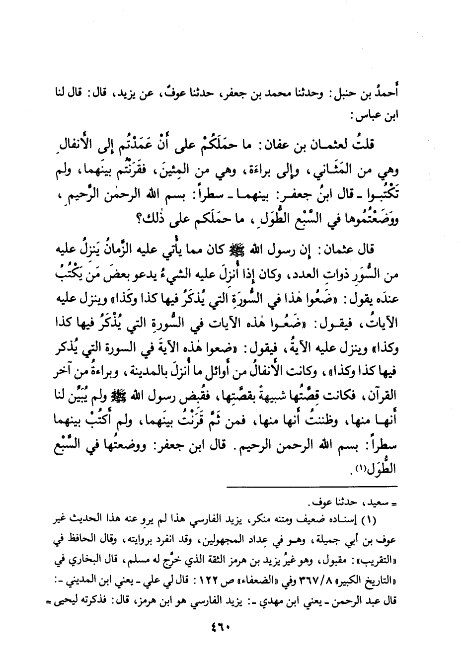 قُلْتُ لِعُثْمَانَ بْنِ عَفَّانَ: مَا حَمَلَكُمْ عَلَى أَنْ عَمَدْتُمْ إِلَى الْأَنْفَالِ وَهِيَ مِنَ الْمَثَانِي، وَإِلَى بَرَاءَةٌ، وَهِيَ مِنَ الْمِئِينَ، فَقَرَنْتُمْ بَيْنَهُمَا، وَلَمْ تَكْتُبُوا - قَالَ ابْنُ جَعْفَرٍ: بَيْنَهُمَا - سَطْرًا: بِسْمِ اللهِ الرَّحْمَنِ الرَّحِيمِ، وَوَضَعْتُمُوهَا فِي السَّبْعِ الطِّوَالِ، مَا حَمَلَكُمْ عَلَى ذَلِكَ؟