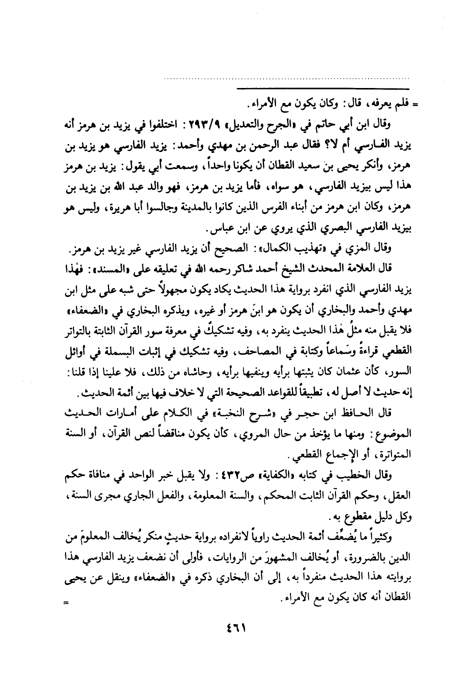 وكثيراً ما يُضعِّف أئمة الحديث راوياً لانفراده برواية حديثٍ منكر يُخالف المعلومَ من الدين بالضرورة، أو يُخالف المشهورَ من الروايات، فأولى أن نضعف يزيد الفارسي هذا بروايته هذا الحديث منفرداً به، إلى أن البخاري ذكره في " الضعفاء " وينقل عن يحيى القطان أنه كان يكون مع الأمراء. =