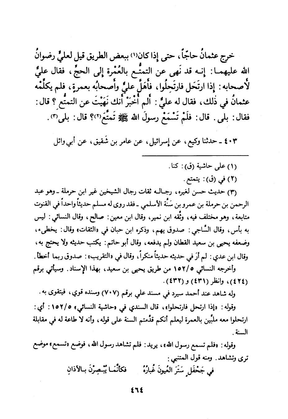 خَرَجَ عُثْمَانُ حَاجًّا، حَتَّى إِذَا كَانَ (١) بِبَعْضِ الطَّرِيقِ، قِيلَ لِعَلِيٍّ رِضْوَانُ اللهِ عَلَيْهِمَا: إِنَّهُ قَدْ نَهَى عَنِ التَّمَتُّعِ بِالْعُمْرَةِ إِلَى الْحَجِّ، فَقَالَ عَلِيٌّ لِأَصْحَابِهِ: إِذَا ارْتَحَلَ فَارْتَحِلُوا، فَأَهَلَّ عَلِيٌّ وَأَصْحَابُهُ بِعُمْرَةٍ، فَلَمْ يُكَلِّمْهُ عُثْمَانُ فِي ذَلِكَ، فَقَالَ لَهُ عَلِيٌّ أَلَمْ أُخْبَرْ أَنَّكَ نَهَيْتَ عَنِ التَّمَتُّعِ؟ قَالَ: فَقَالَ: بَلَى. قَالَ: فَلَمْ تَسْمَعْ رَسُولَ اللهِ صَلَّى اللهُ عَلَيْهِ وَسَلَّمَ تَمَتَّعَ (٢) ؟ قَالَ: بَلَى (٣) .