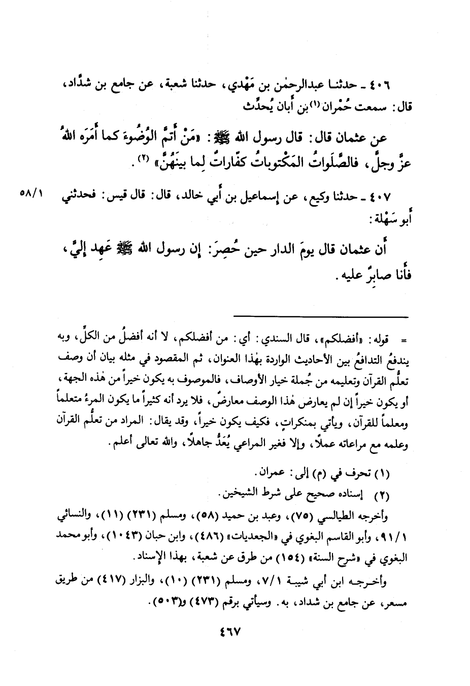 ٤٠٦ - حَدَّثَنَا عَبْدُ الرَّحْمَنِ بْنُ مَهْدِيٍّ، حَدَّثَنَا شُعْبَةُ، عَنْ جَامِعِ بْنِ شَدَّادٍ، قَالَ: سَمِعْتُ حُمْرَانَ (١) بْنَ أَبَانَ يُحَدِّثُ