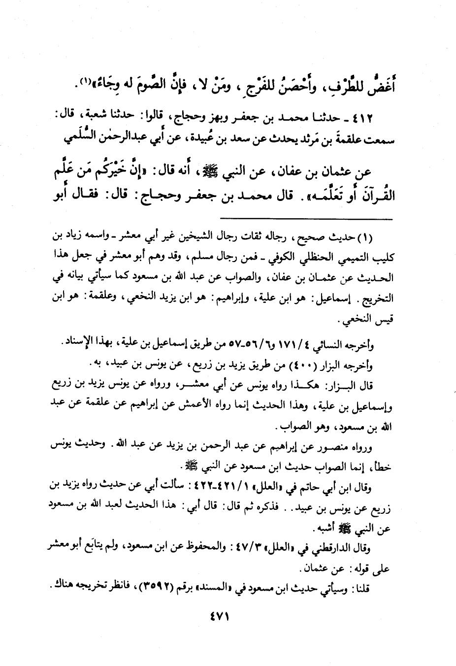 ٤١٢ - حَدَّثَنَا مُحَمَّدُ بْنُ جَعْفَرٍ، وَبَهْزٌ، وَحَجَّاجٌ، قَالُوا: حَدَّثَنَا شُعْبَةُ، قَالَ: سَمِعْتُ عَلْقَمَةَ بْنَ مَرْثَدٍ يُحَدِّثُ عَنْ سَعْدِ بْنِ عُبَيْدَةَ، عَنْ أَبِي عَبْدِ الرَّحْمَنِ السُّلَمِيِّ