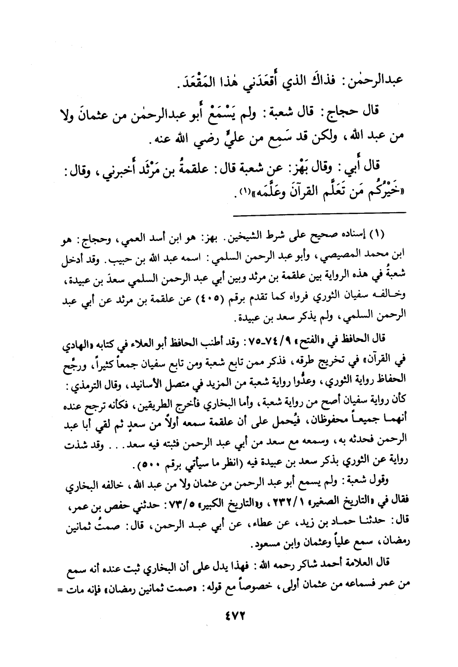 كأن رواية سفيان أصح من رواية شعبة، وأما البخاري فأخرج الطريقين، فكأنه ترجح عنده أنهما جميعاً محفوظان، فيُحمل على أن علقمة سمعه أولاً من سعدٍ ثم لقي أبا عبد الرحمن فحدثه به، وسمعه مع سعد من أبي عبد الرحمن فثبته فيه سعد ... وقد شذت رواية عن الثوري بذكر سعد بن عبيدة فيه (انظر ما سيأتي برقم ٥٠٠) .