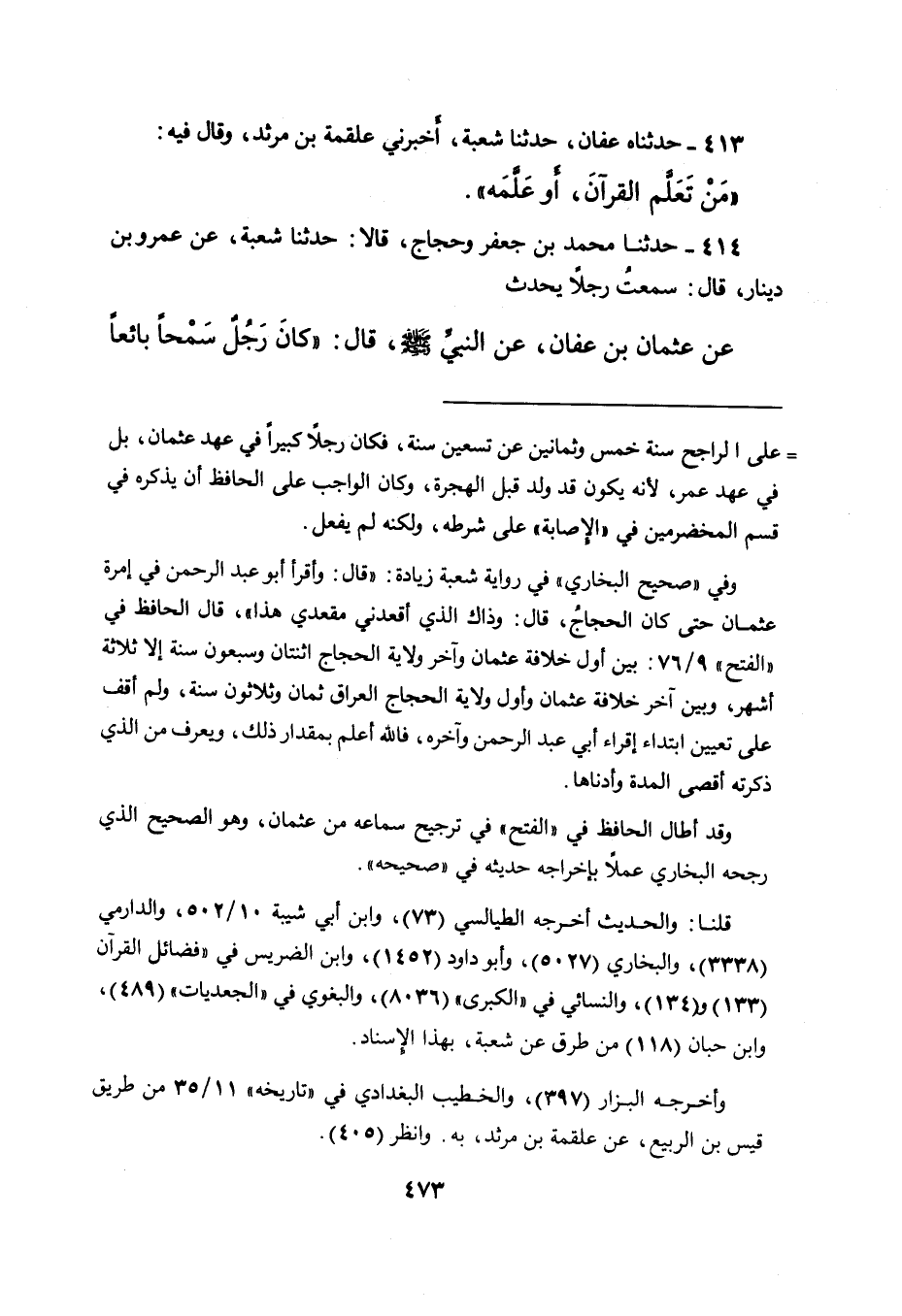 ٤١٣ - حَدَّثَنَا عَفَّانُ، حَدَّثَنَا شُعْبَةُ، أَخْبَرَنِي عَلْقَمَةُ بْنُ مَرْثَدٍ، وَقَالَ فِيهِ: " مَنْ تَعَلَّمَ الْقُرْآنَ، أَوْ عَلَّمَهُ ".
