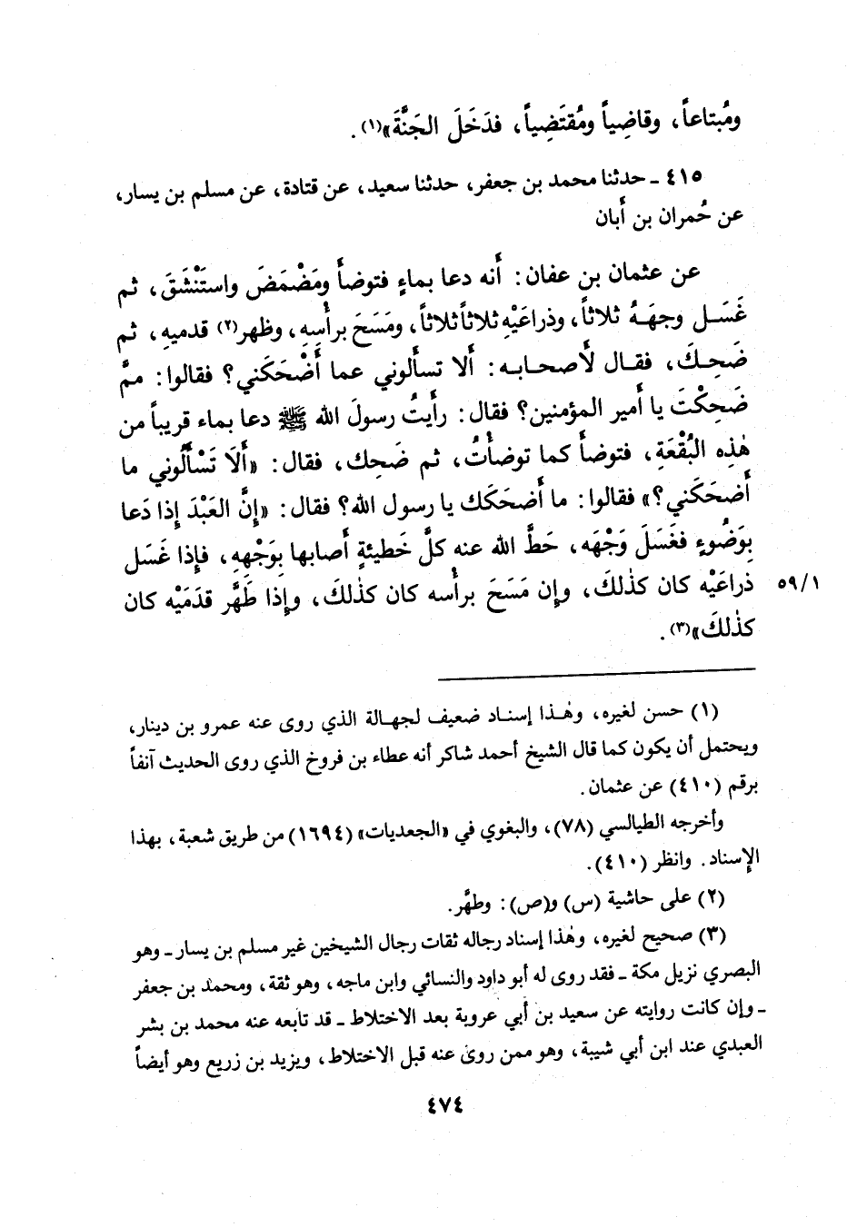 ٤١٥ - حَدَّثَنَا مُحَمَّدُ بْنُ جَعْفَرٍ، حَدَّثَنَا سَعِيدٌ، عَنْ قَتَادَةَ، عَنْ مُسْلِمِ بْنِ يَسَارٍ، عَنْ حُمْرَانَ بْنِ أَبَانَ
