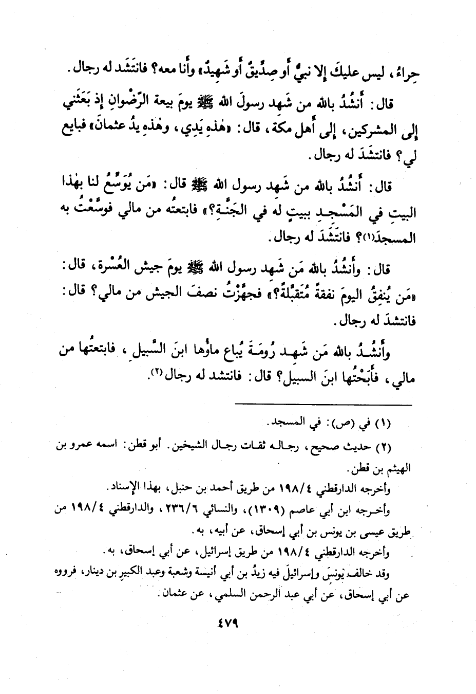 وَأَنْشُدُ بِاللهِ مَنْ شَهِدَ رُومَةَ يُبَاعُ مَاؤُهَا ابْنَ السَّبِيلِ، فَابْتَعْتُهَا مِنْ مَالِي، فَأَبَحْتُهَا لِابْنِ السَّبِيلِ؟ قَالَ: فَانْتَشَدَ لَهُ رِجَالٌ (٢) .