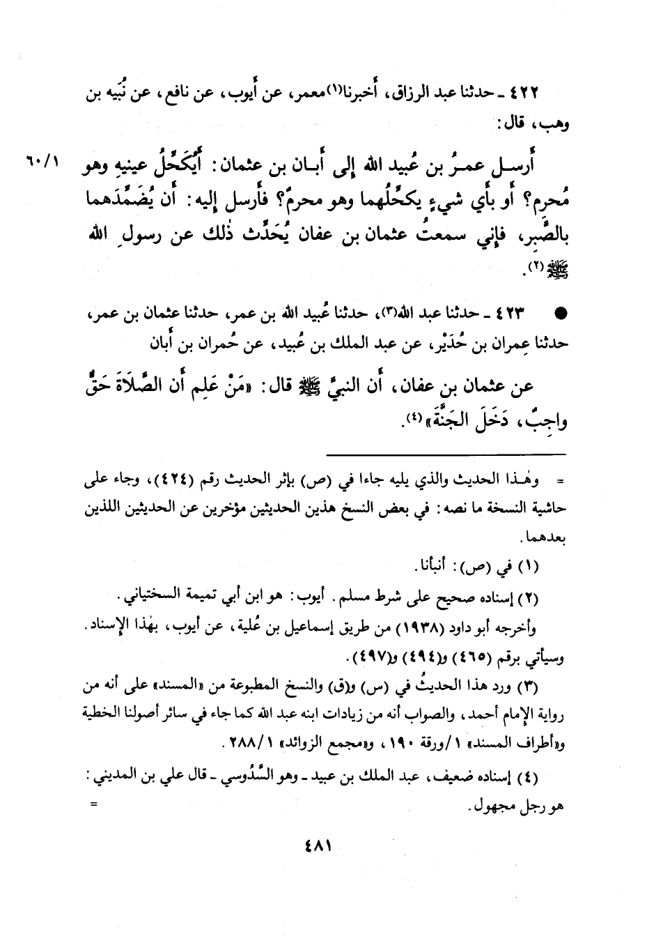 ٤٢٢ - حَدَّثَنَا عَبْدُ الرَّزَّاقِ، أَخْبَرَنَا (١) مَعْمَرٌ، عَنْ أَيُّوبَ، عَنْ نَافِعٍ، عَنْ نُبَيْهِ بْنِ وَهْبٍ، قَالَ: