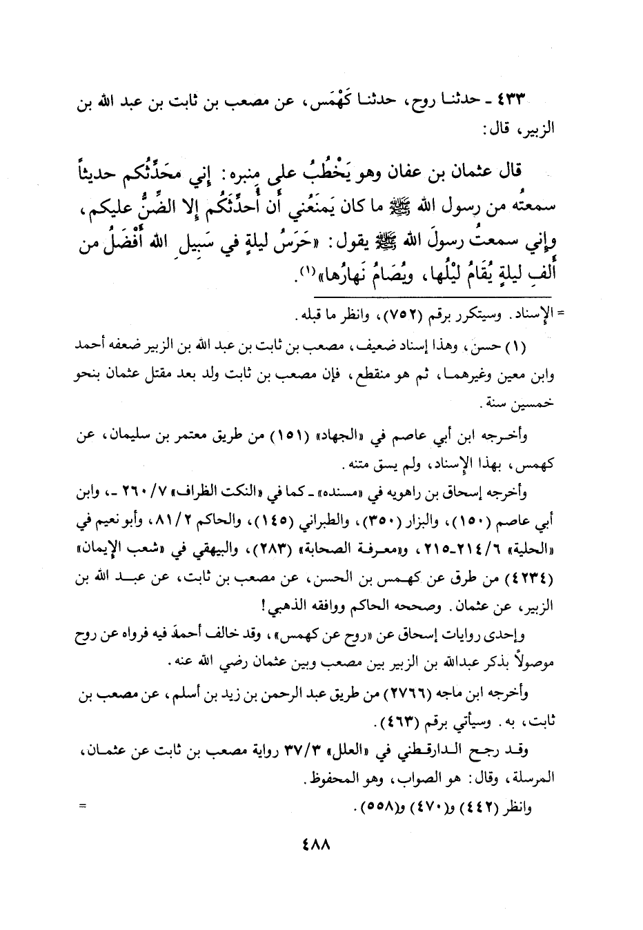 وأخرجه إسحاق بن راهويه في " مسنده " - كما في " النكت الظراف " ٧ / ٢٦٠ -، وابن أبي عاصم (١٥٠) ، والبزار (٣٥٠) ، والطبراني (١٤٥) ، والحاكم ٢ / ٨١، وأبو نعيم في " الحلية " ٦ / ٢١٤ - ٢١٥، و" معرفة الصحابة " (٢٨٣) ، والبيهقي في " شعب الإيمان " (٤٢٣٤) من طرق عن كهمس بن الحسن، عن مصعب بن ثابت، عن عبد الله بن الزبير، عن عثمان. وصححه الحاكم ووافقه الذهبي!