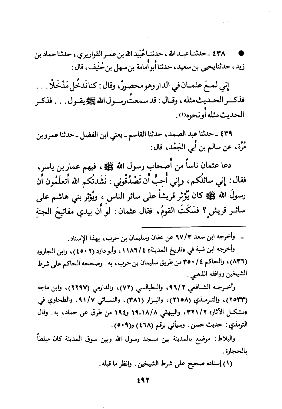 دَعَا عُثْمَانُ نَاسًا مِنْ أَصْحَابِ رَسُولِ اللهِ صَلَّى اللهُ عَلَيْهِ وَسَلَّمَ، فِيهِمْ عَمَّارُ بْنُ يَاسِرٍ، فَقَالَ: إِنِّي سَائِلُكُمْ، وَإِنِّي أُحِبُّ أَنْ تَصْدُقُونِي: نَشَدْتُكُمُ اللهَ أَتَعْلَمُونَ أَنَّ رَسُولَ اللهِ صَلَّى اللهُ عَلَيْهِ وَسَلَّمَ كَانَ يُؤْثِرُ قُرَيْشًا عَلَى سَائِرِ النَّاسِ، وَيُؤْثِرُ بَنِي هَاشِمٍ عَلَى سَائِرِ قُرَيْشٍ؟ فَسَكَتَ الْقَوْمُ، فَقَالَ عُثْمَانُ: لَوْ أَنَّ بِيَدِي مَفَاتِيحَ الْجَنَّةِ