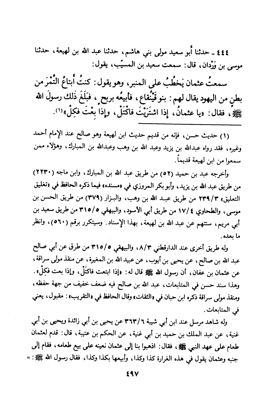 ٤٤٤ - حَدَّثَنَا أَبُو سَعِيدٍ مَوْلَى بَنِي هَاشِمٍ، حَدَّثَنَا عَبْدُ اللهِ بْنُ لَهِيعَةَ، حَدَّثَنَا مُوسَى بْنُ وَرْدَانَ، قَالَ: سَمِعْتُ سَعِيدَ بْنَ الْمُسَيِّبِ، يَقُولُ: