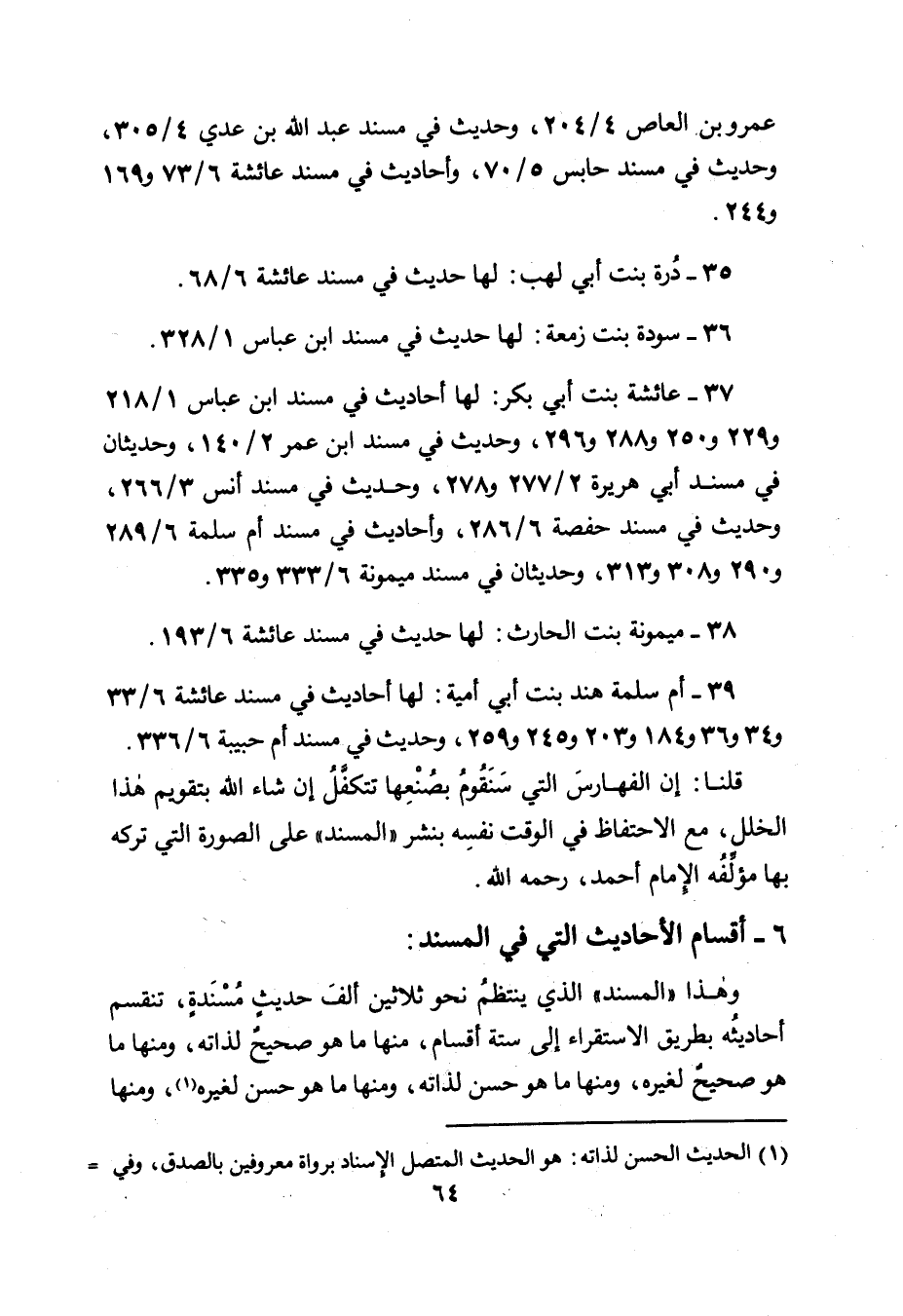وهذا " المسند " الذي ينتظمُ نحو ثلاثين ألفَ حديثٍ مُسْنَدةٍ، تنقسم أحاديثُه بطريق الاستقراء إلى ستة أقسام، منها ما هو صحيحٌ لذاته، ومنها ما هو صحيحٌ لغيره، ومنها ما هو حسن لذاته، ومنها ما هو حسن لغيره (١) ، ومنها