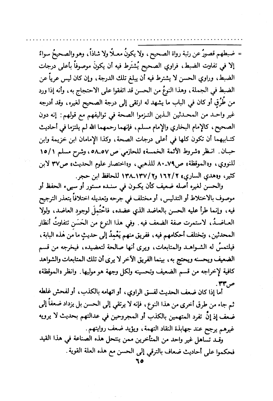 = ضبطهم قصورٌ عن رتبة رواة الصحيح، ولا يكونُ معلاً ولا شاذاً، وهو والصحيحُ سواءٌ إلا في تفاوت الضبط، فراوي إلصحيح يُشتَرط فيه أن يكونَ موصوفاً بأعلى درجات الضبط، وراوي الحسن لا يشترط فيه أن يبلغ تلك الدرجة، وإن كان ليس عرياً عن الضبط في الجملة، وهذا النوعُ من الحسن قد اتفقوا على الاحتجاج به، وأنه إذا ورد من طُرُقٍ أو كان في الباب ما يشهد له ارتقى إلى درجة الصحيح لغيره، وقد أدرجه غير واحد من المحدثين الذين التزموا الصحة في تواليفهم مع قولهم: إنه دون الصحيح، كالإمام البخاري والإمام مسلم، فإنهما رحمهما الله لم يلتزما في أحاديث كتابيهما أن تكون كلها في أعلى درجات الصحة، وكذا الإمامان ابن خزيمة وابن حبان. انظر " شروط الأئمة الخمسة " للحازمي ص ٥٧ - ٥٨ وشرح مسلم ١ / ١٥ للنووي، و " الموقظة " ص ٧٩ - ٨٠ للذهبي، و " اختصار علوم الحديث " ص ٣٧ لابن كثير، و " هدي الساري " ٢ / ١٦٢ و ٢ / ١٣٧ - ١٣٨ للحافظ ابن حجر.