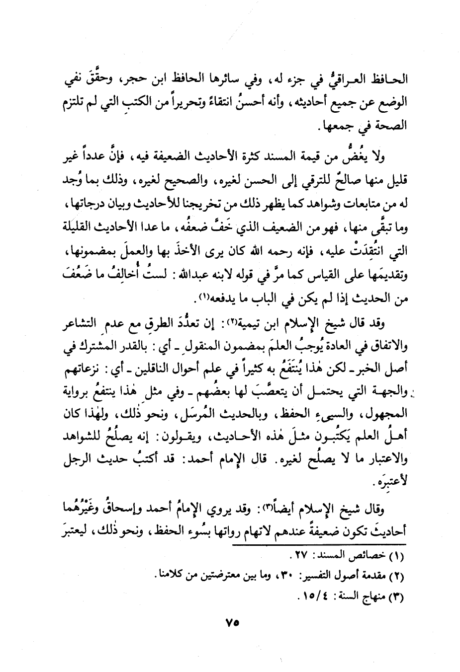 ولا يغُضُّ من قيمة المسند كثرة الأحاديث الضعيفة فيه، فإنَّ عدداً غير قليل منها صالحٌ للترقي إلى الحسن لغيره، والصحيح لغيره، وذلك بما وُجد له من متابعات وشواهد كما يظهر ذلك من تخريجنا للأحاديث وبيان درجاتها، وما تبقَّى منها، فهو من الضعيف الذي خَفَّ ضعفُه، ما عدا الأحاديث القليلة التي انتُقِدَتْ عليه، فإنه رحمه الله كان يرى الأخذَ بها والعملَ بمضمونها، وتقديمَها على القياس كما مرَّ في قوله لابنه عبد الله: لستُ أُخالِفُ ما ضَعُفَ من الحديث إذا لم يكن في الباب ما يدفعه (١) .