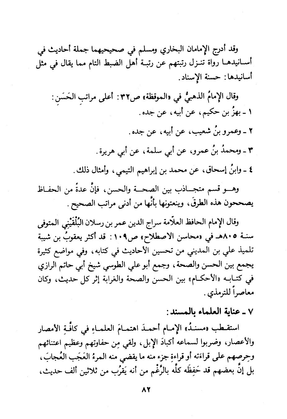 وقال الإِمام الحافظ العلاّمة سراج الدين عمر بن رسلان البُلْقَيْنِي المتوفى سنة ٨٠٥ هـ في " محاسن الاصطلاح " ص ١٠٩: قد أكثر يعقوبُ بن شيبة تلميذ علي بن المديني من تحسين الأحاديث في كتابه، وفي مواضع كثيرة يجمع بين الحسن والصحة، وجمع أبو علي الطوسي شيخ أبي حاتم الرازي