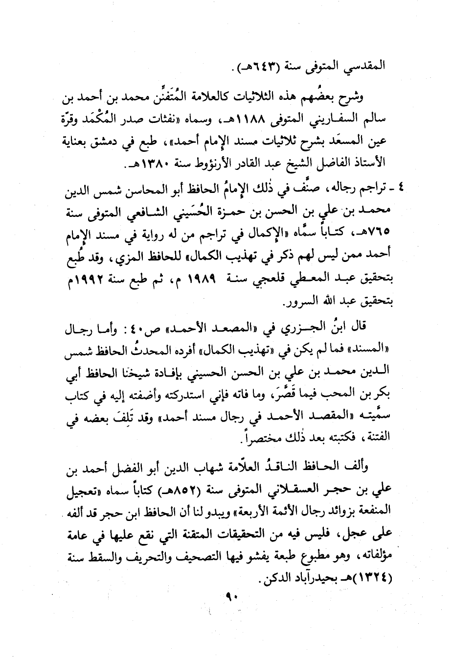 قال ابنُ الجزري في " المصعد الأحمد " ص ٤٠: وأما رجال " المسند " فما لم يكن في " تهذيب الكمال " أفرده المحدثُ الحافظ شمس الدين محمد بن علي بن الحسن الحسيني بإفادة شيخنا الحافظ أبي بكر بن المحب فيما قَصَّرَ، وما فاته فإني استدركته وأضفته إليه في كتاب سميته " المقصد الأحمد في رجال مسند أحمد " وقد تَلِفَ بعضه في الفتنة، فكتبته بعد ذلك مختصراً.